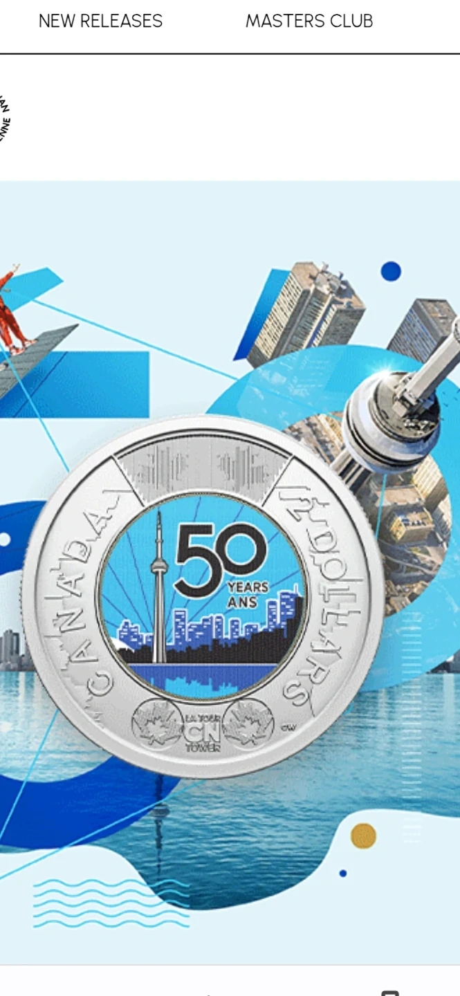 Commemorative coin celebrating 50 years of the CN Tower. 2 dollar value. Coin is silver-toned with coloured accents depicting the Toronto skyline and CN Tower.