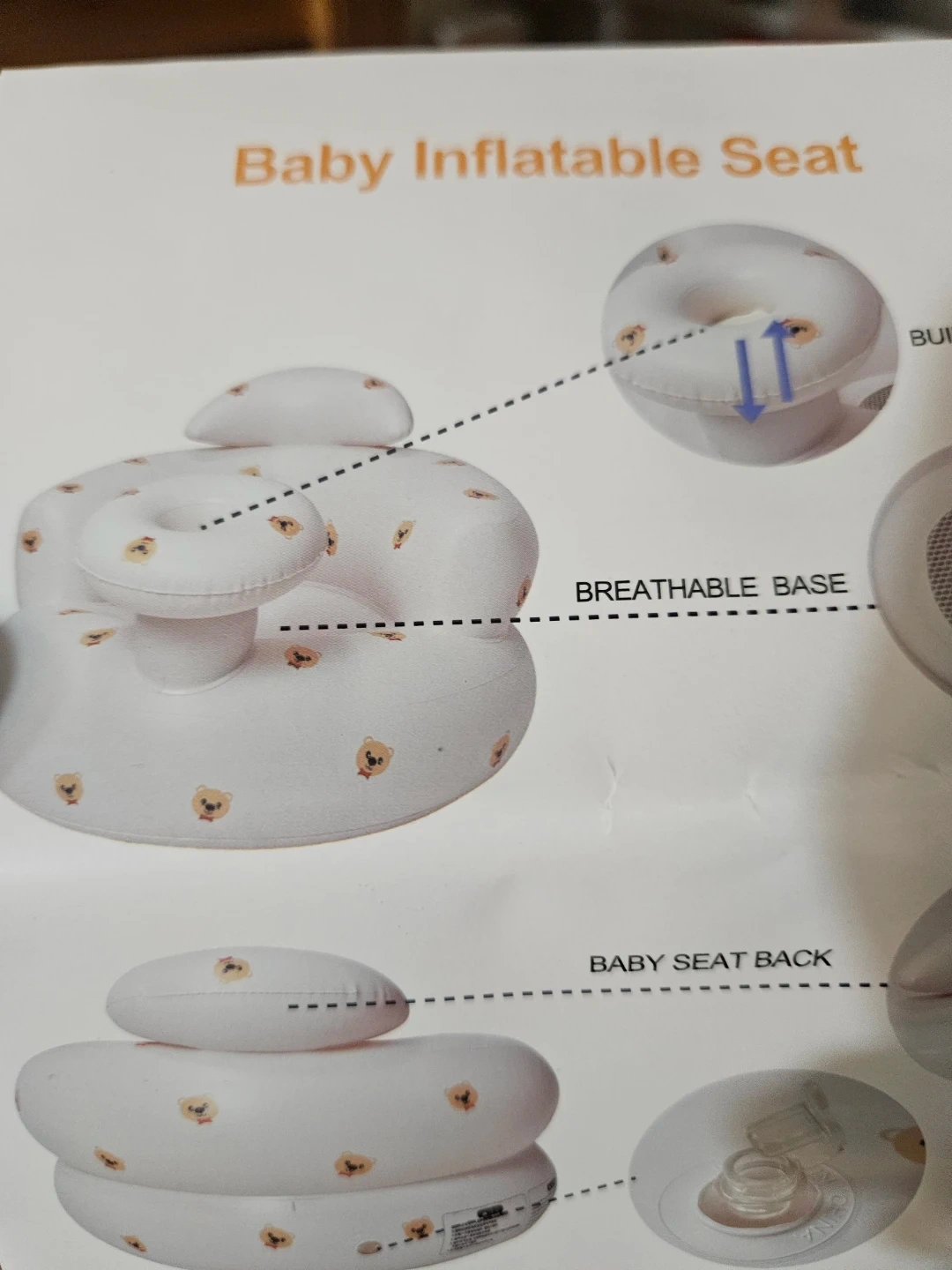 This is a baby inflatable seat designed for comfort and safety. It features a breathable base for added comfort. The seat is decorated with a cute bear print.