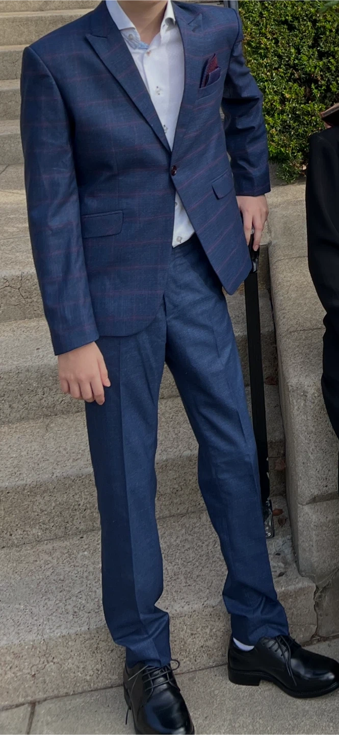 Boys two-piece suit in a navy blue base with a subtle red plaid pattern. Includes a matching jacket and trousers. This suit is perfect for formal events or business occasions. It's made from a durable fabric blend.