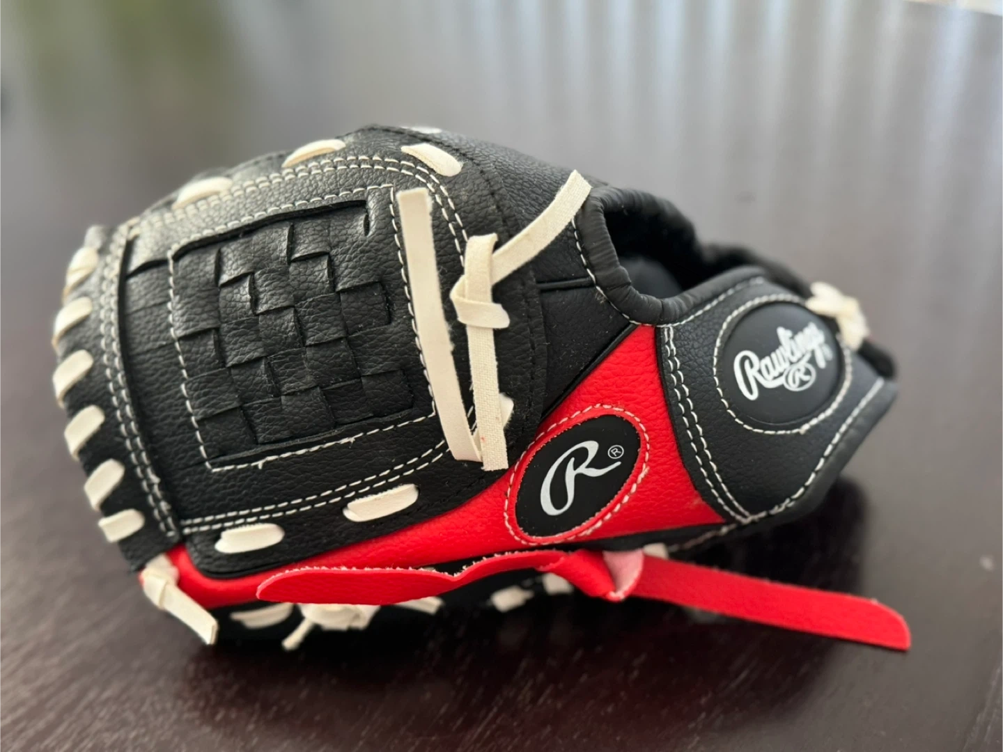 A Rawlings baseball glove in black and red. It's a youth 9 inch glove. Suitable for young baseball players.