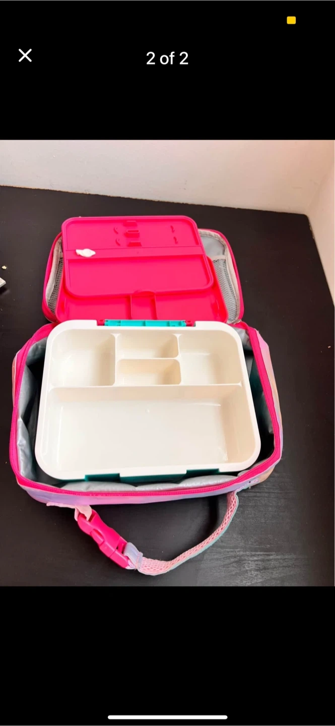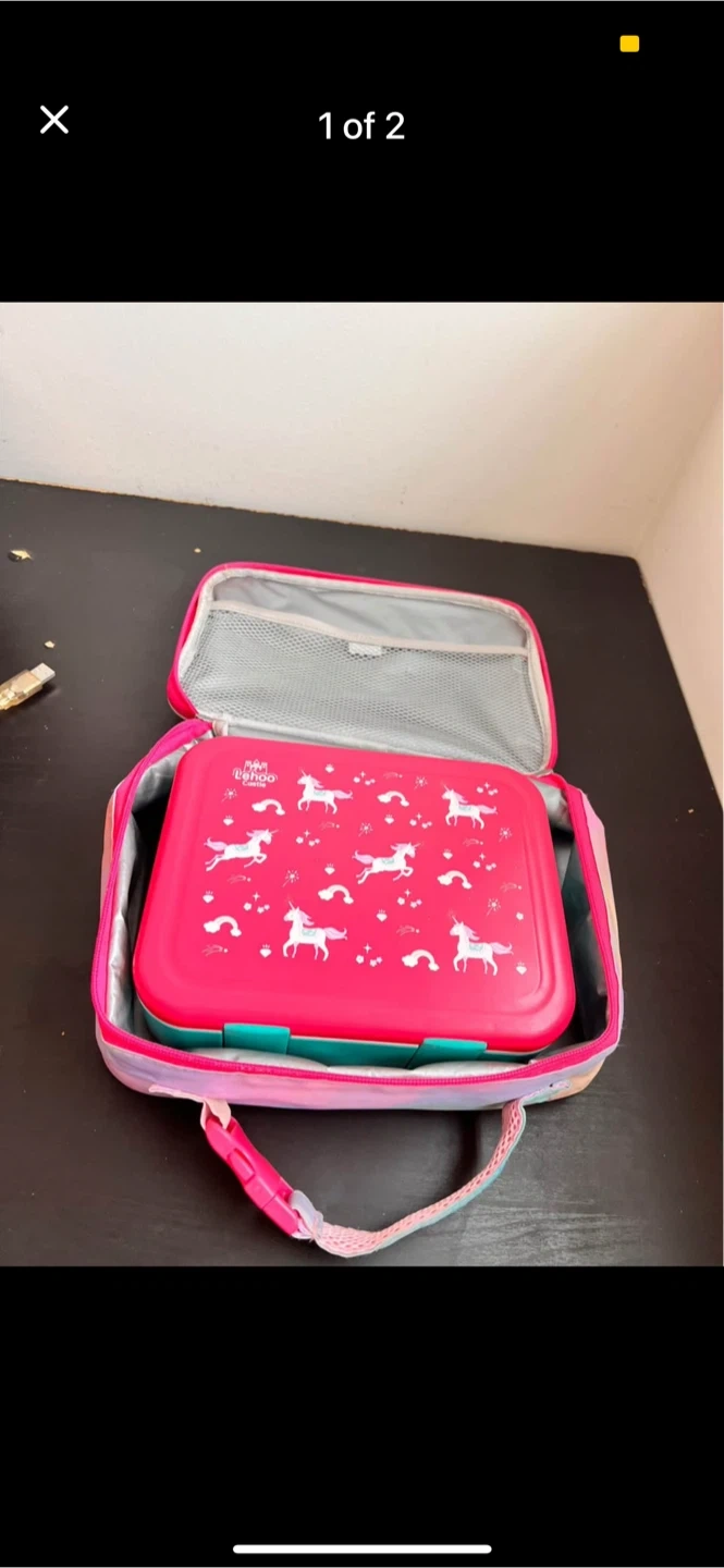 This lunch box has a pink lid with a cute unicorn design. It comes with a compartmentalized inner tray and is housed in an insulated bag with a colourful stripe pattern. This is great for packing lunches for school or outings!