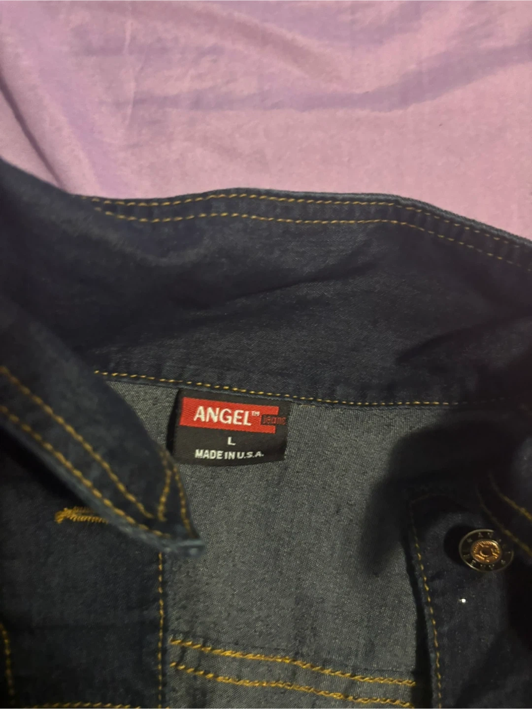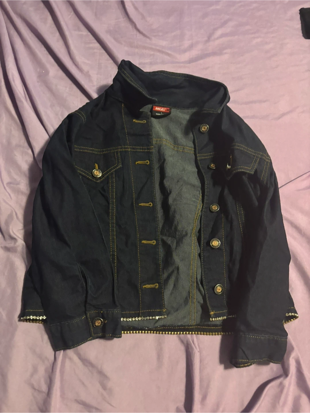 Angel Jeans denim jacket in a dark wash. Size L, made in USA. Features a classic button-up front with embellished hem.