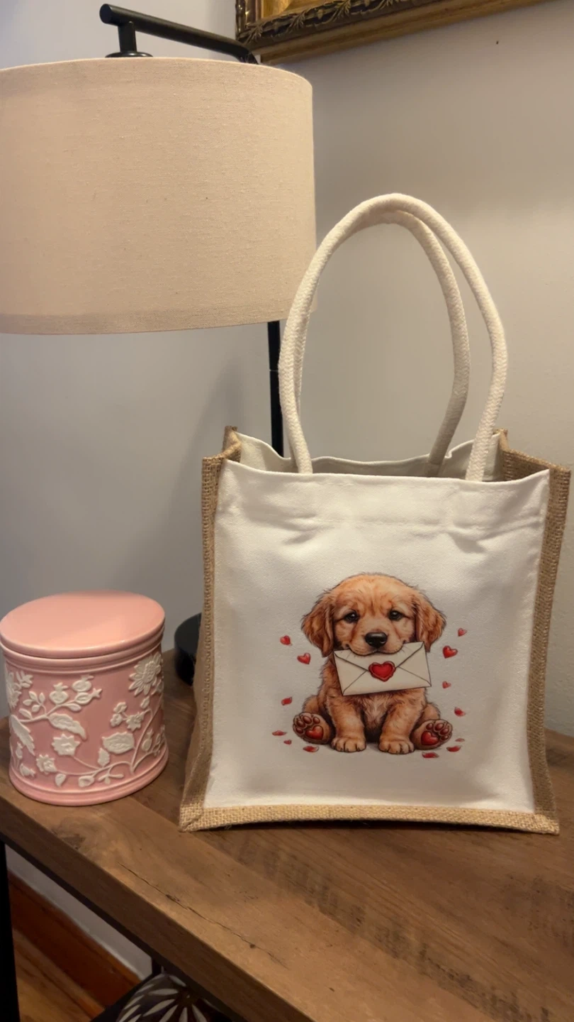 Cute jute tote bag featuring a golden retriever puppy holding a letter with a heart. It's perfect for everyday use or as a gift. Made from durable jute material with sturdy handles.