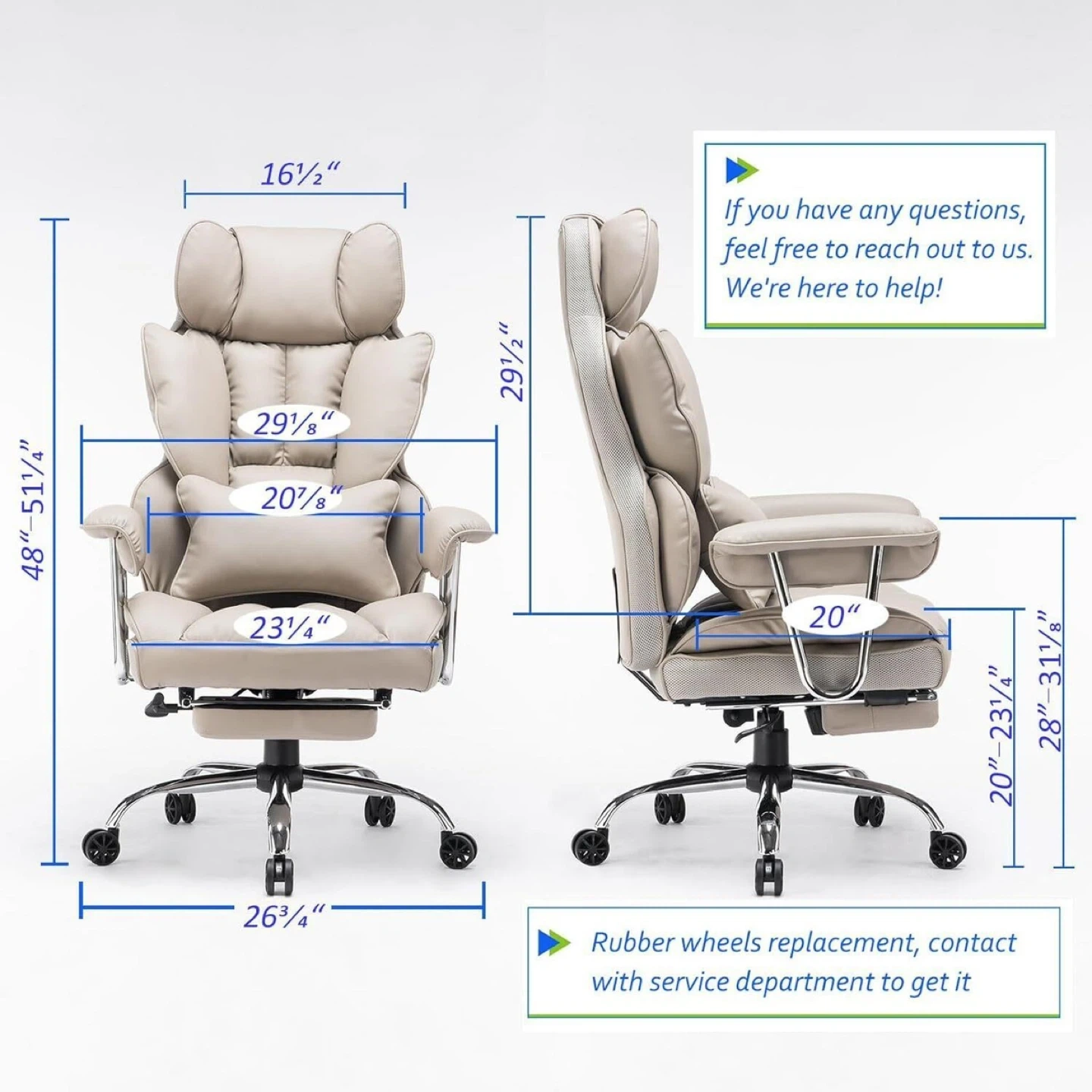 Features: - Supports up to 400 lbs weight capacity - Adjustable height and tilt with up to 135° recline - 360° swivel for ease of movement - Retractable leg rest for relaxation - Ergonomic lumbar support pillow - Oversized seat cushion (20" D x 23.2" W, 4" thick) - High-quality PU leather upholstery with breathable sides - Heavy-duty metal base with smooth casters - Certified for safety and durability (SGS, BIFMA) Condition: Brand new in a sealed box, unassembled Location: Jarvis Street