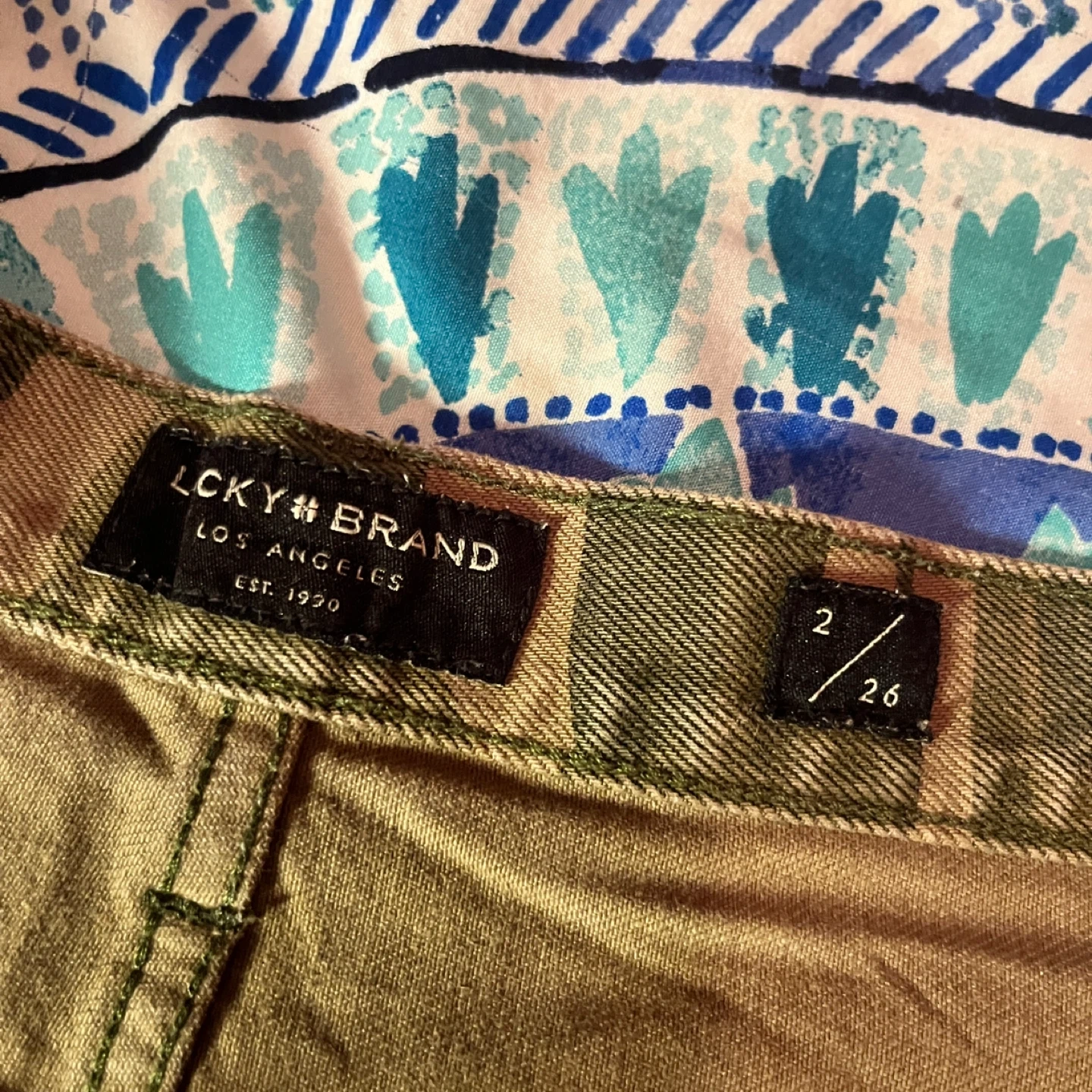 These Lucky Brand shorts with camouflage pattern. They're a size 26 and made from denim. They include distressed detailing for a worn-in look.