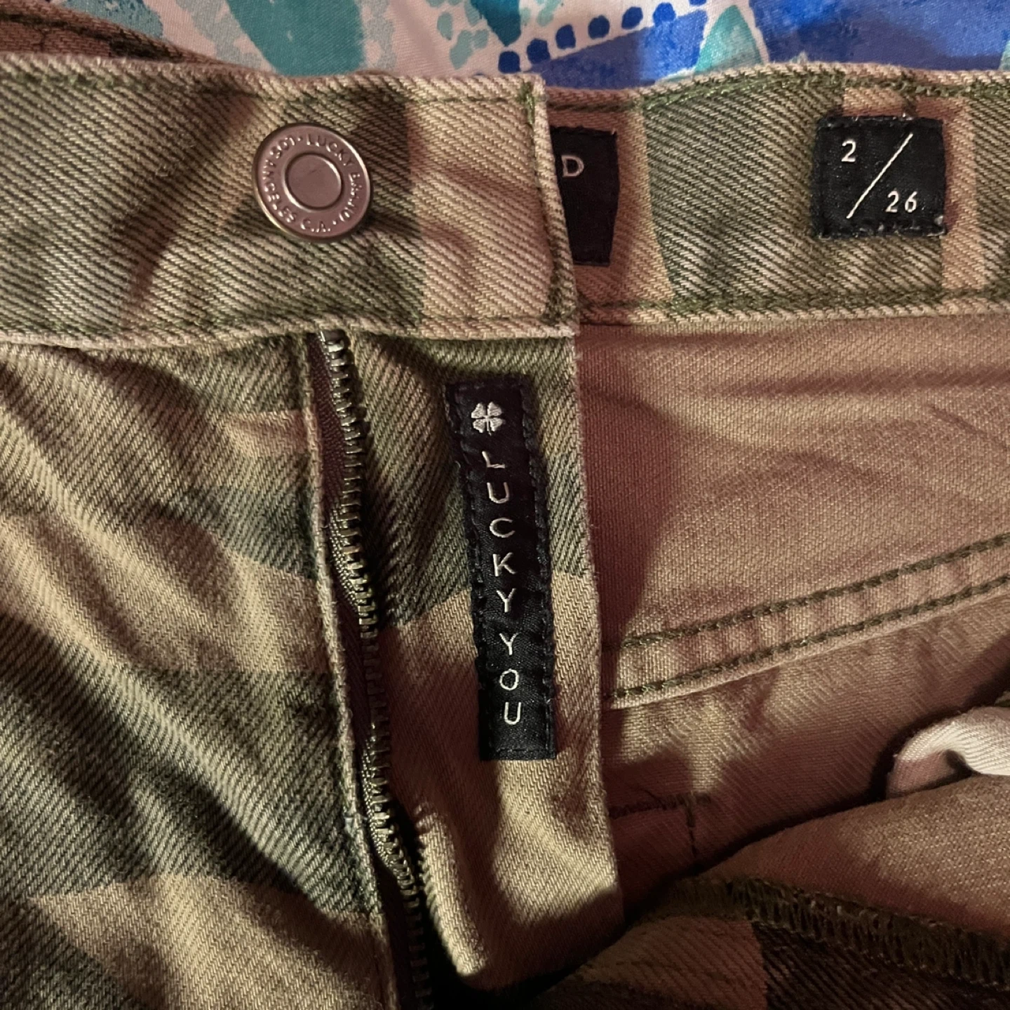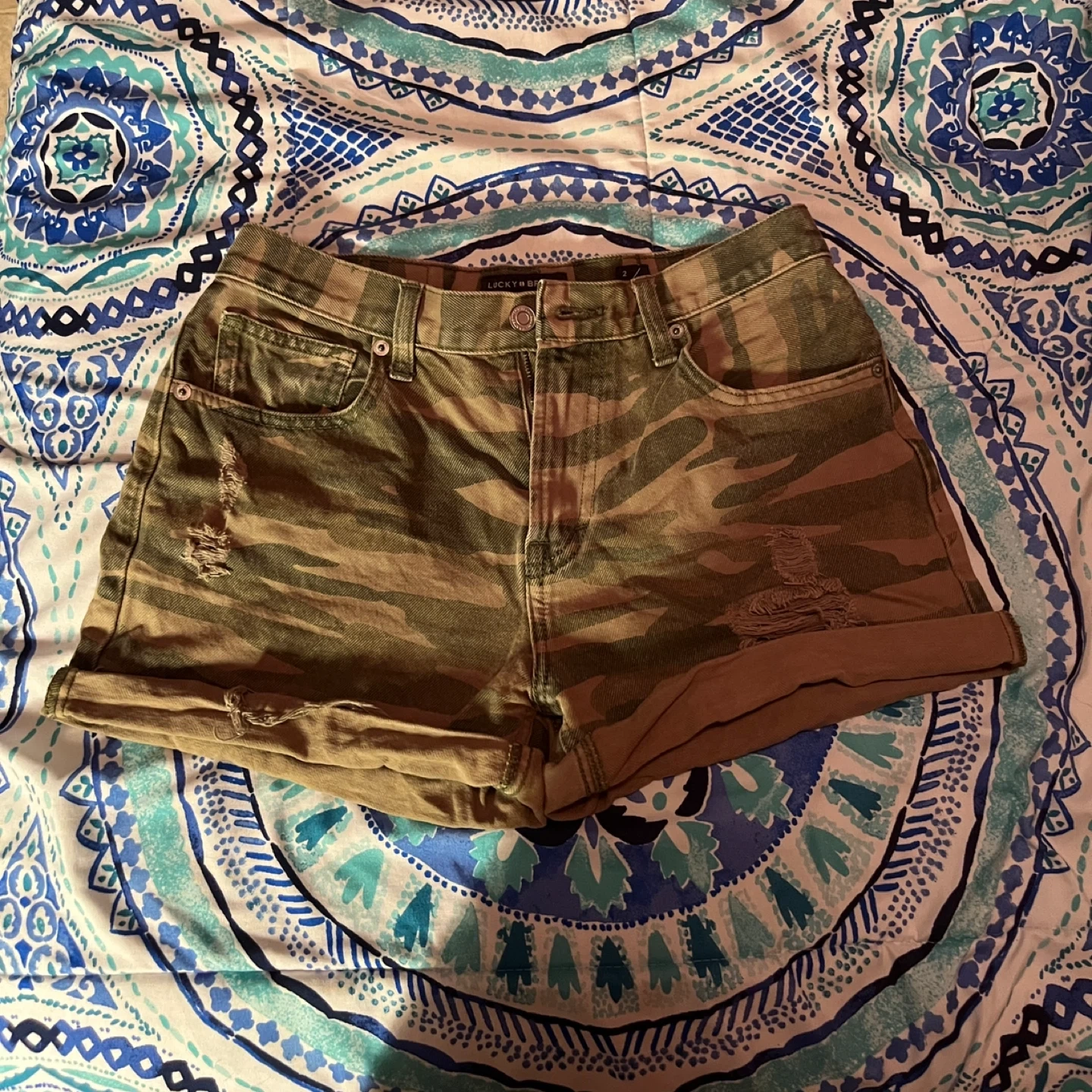 These Lucky Brand shorts with camouflage pattern. They're a size 26 and made from denim. They include distressed detailing for a worn-in look.