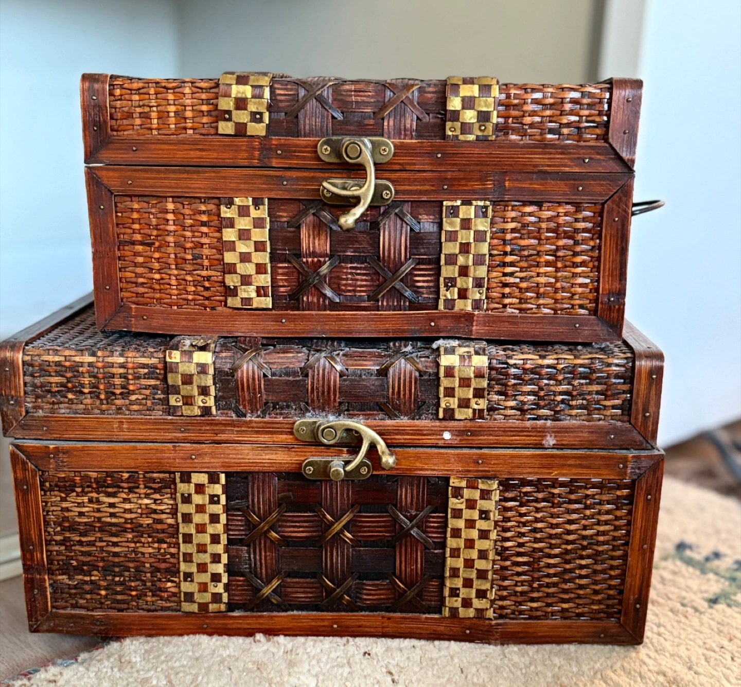 Lovely set of two nesting wicker boxes. Brown woven design with brass accents. Decorative latches. Perfect for organizing or displaying collectibles.