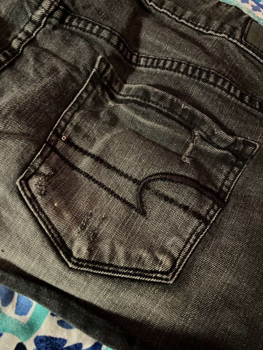 American Eagle black denim mini skirt with a frayed hem. It's a size 6 with stretch fabric. Great for casual wear!