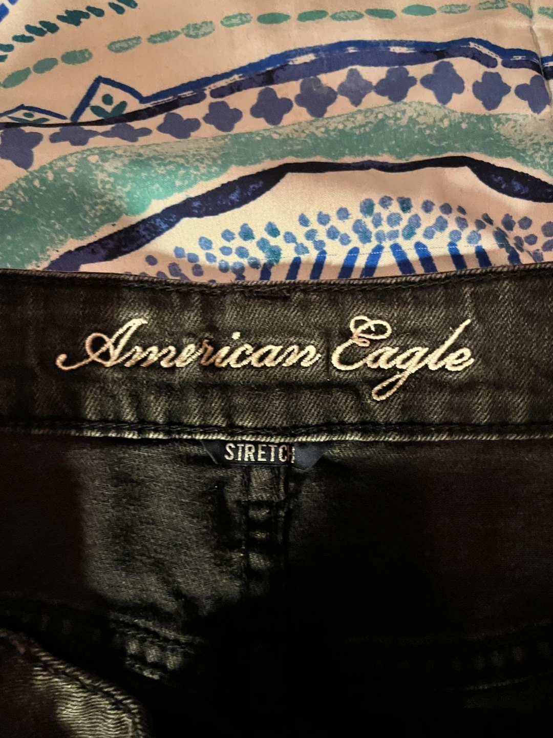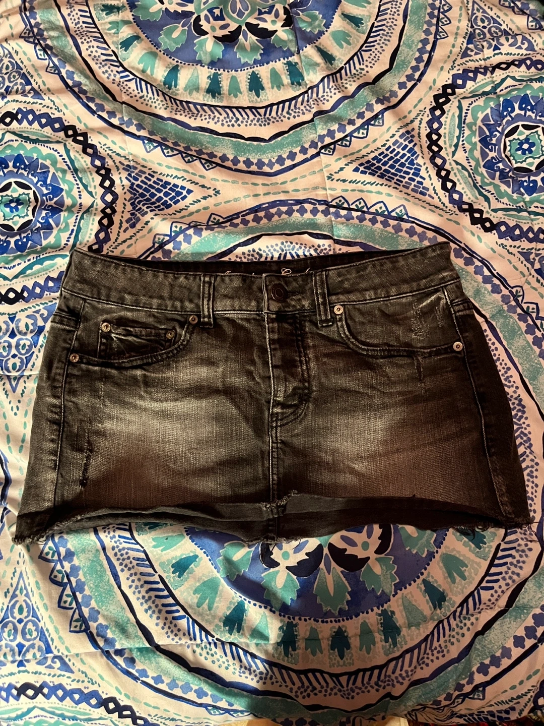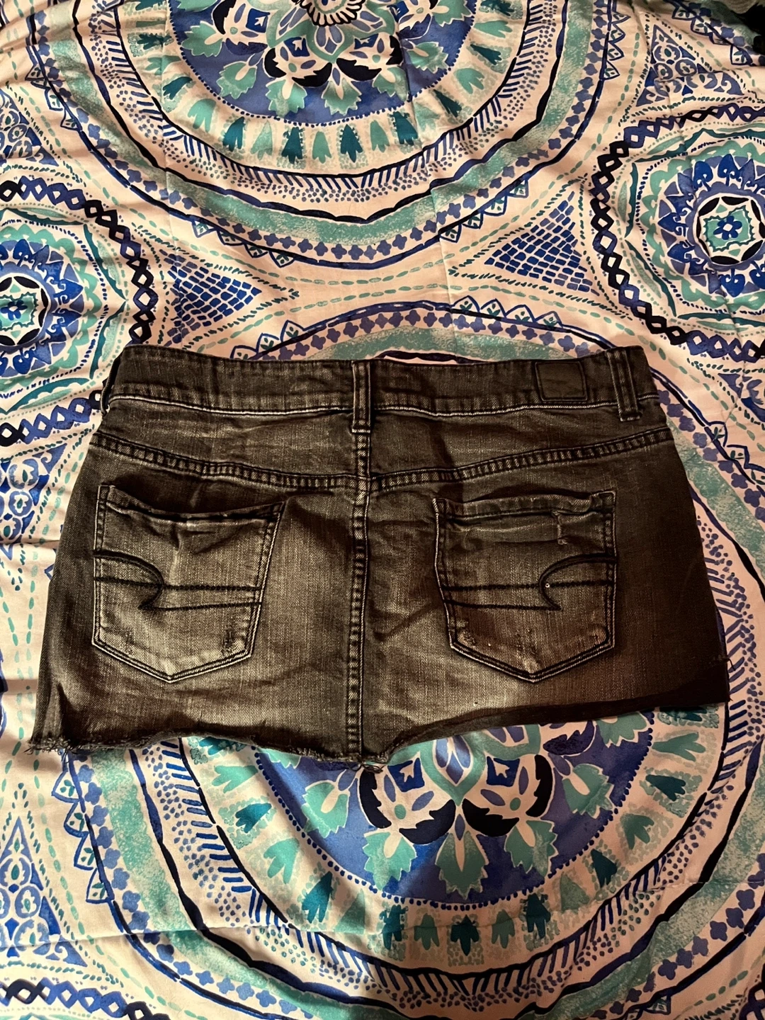 American Eagle black denim mini skirt with a frayed hem. It's a size 6 with stretch fabric. Great for casual wear!