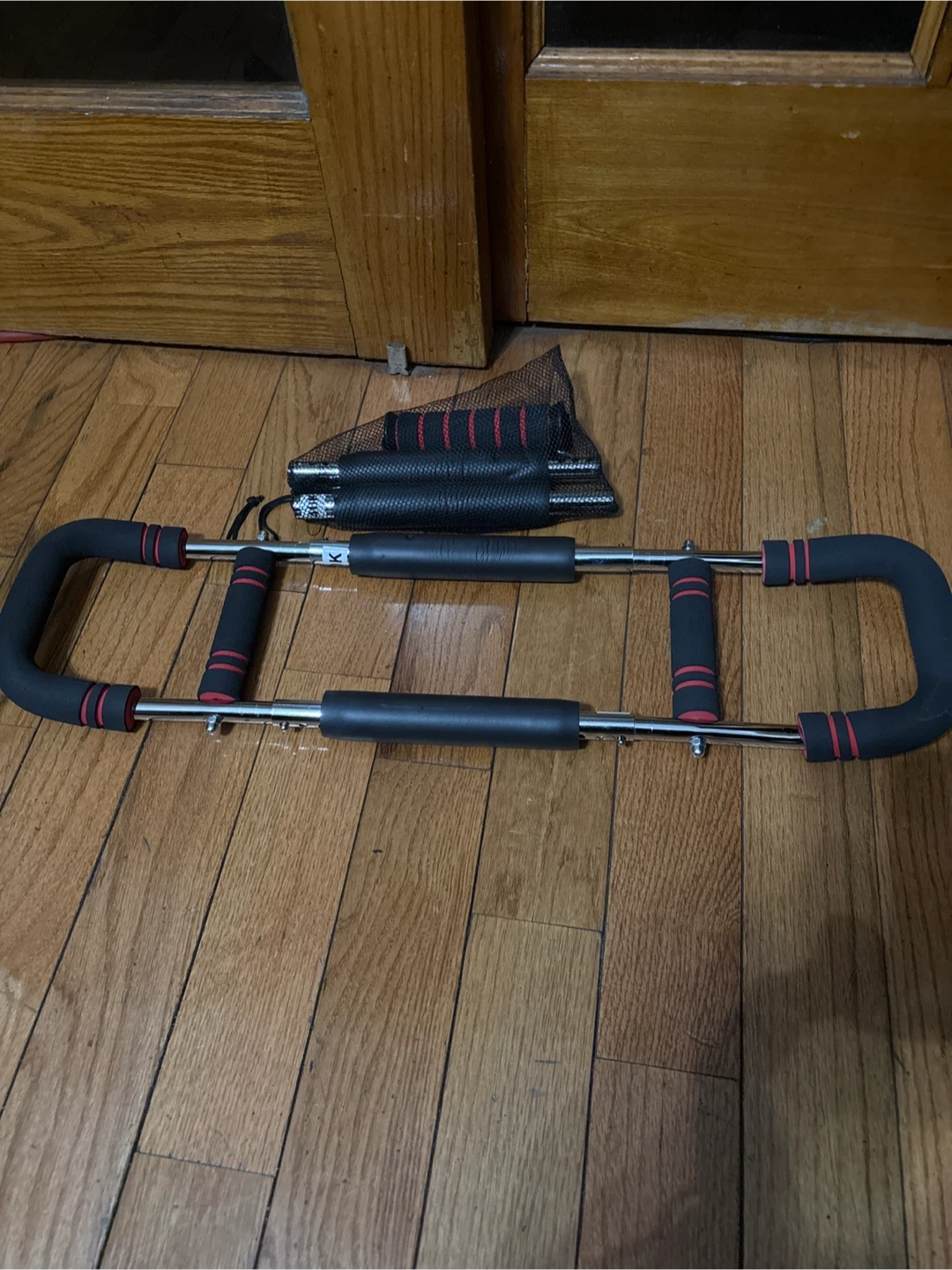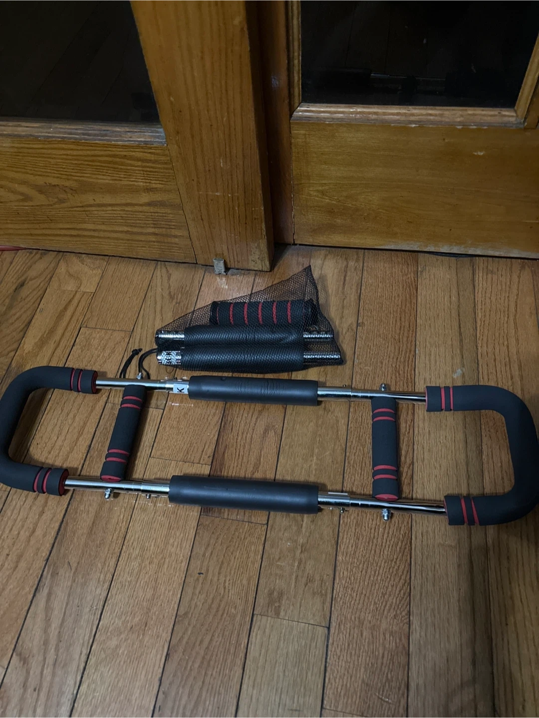 It's made with metal bars and foam grips. The bar is adjustable for different arm exercises Includes a mesh bag for storage.