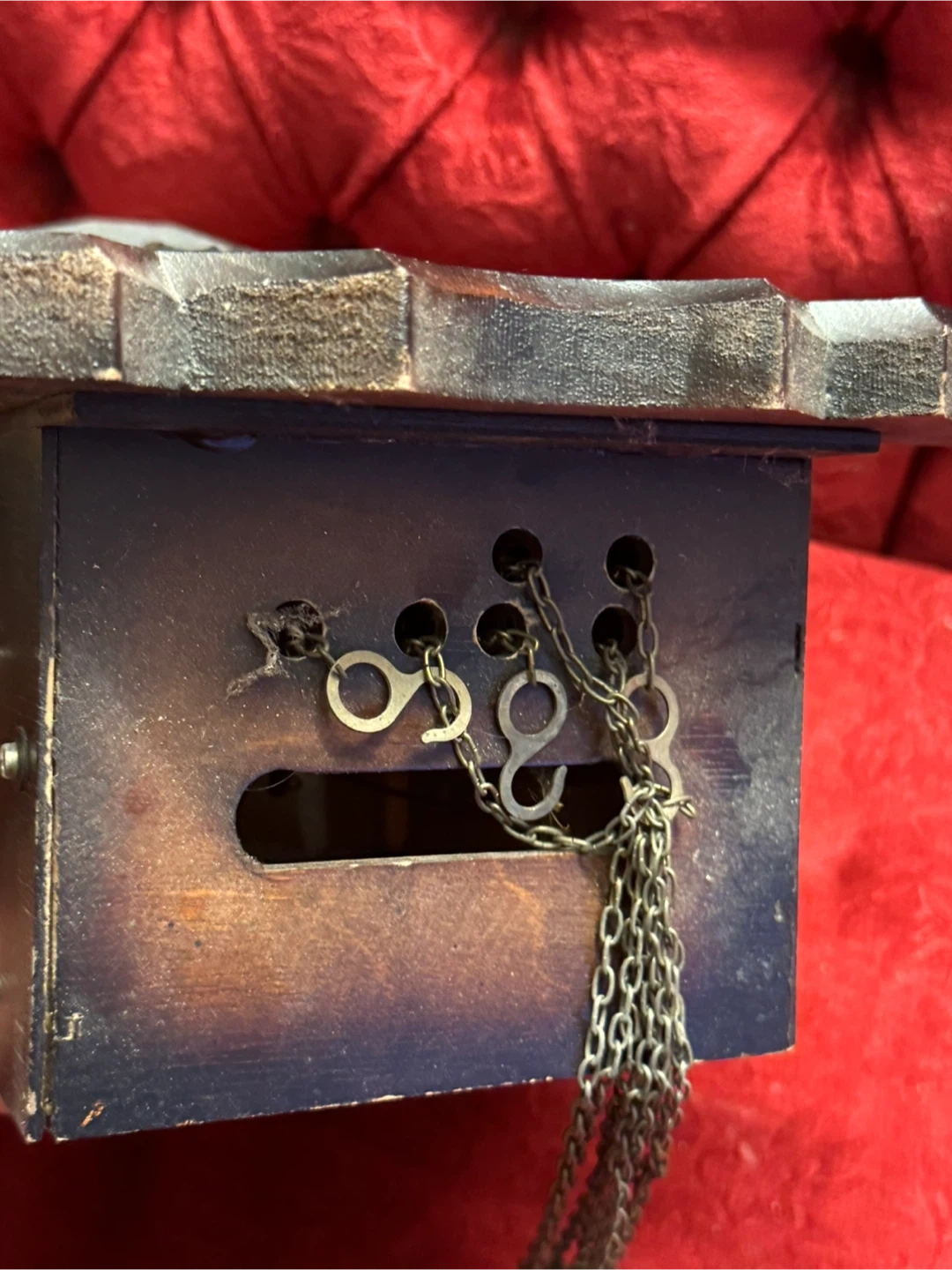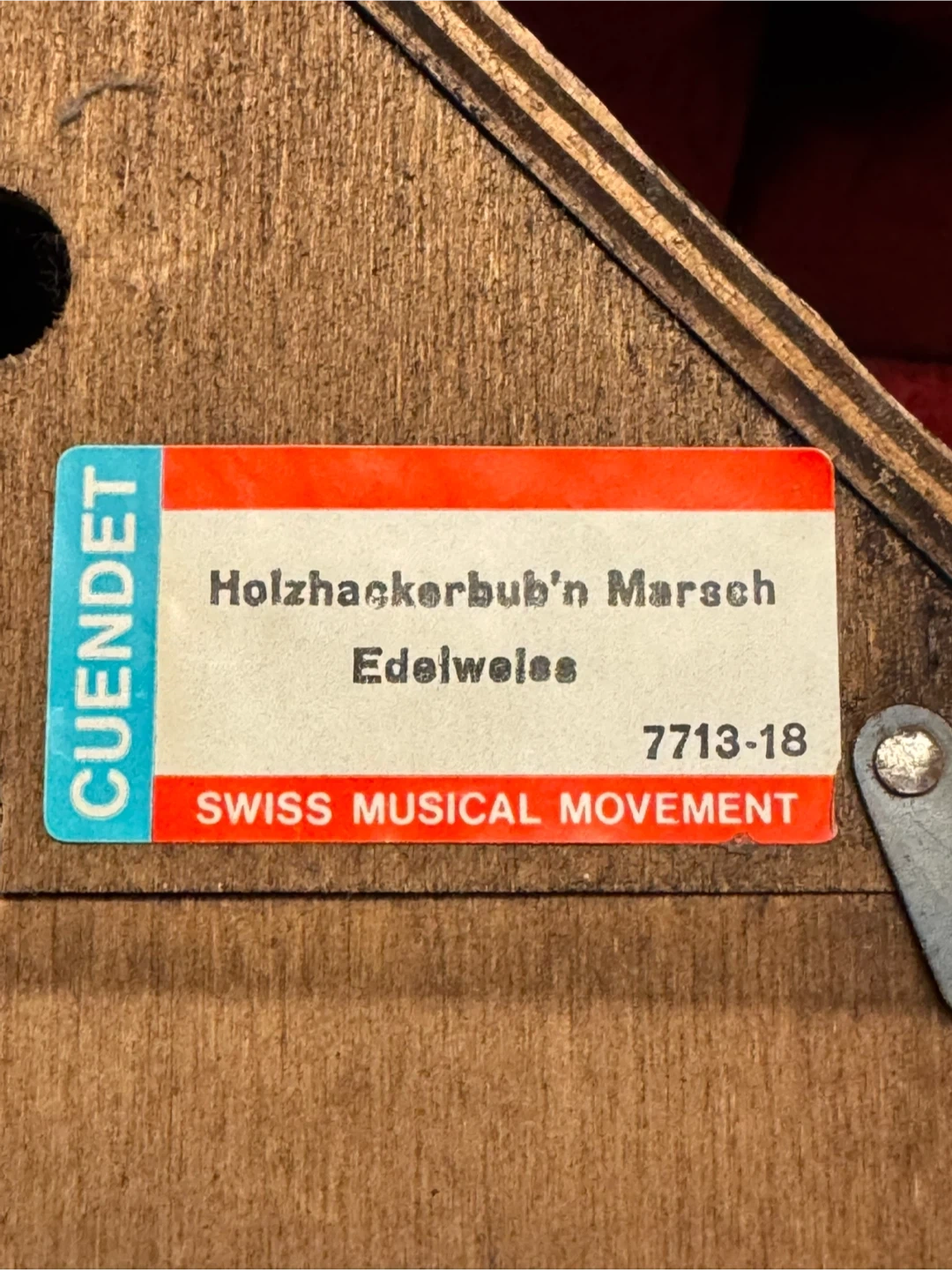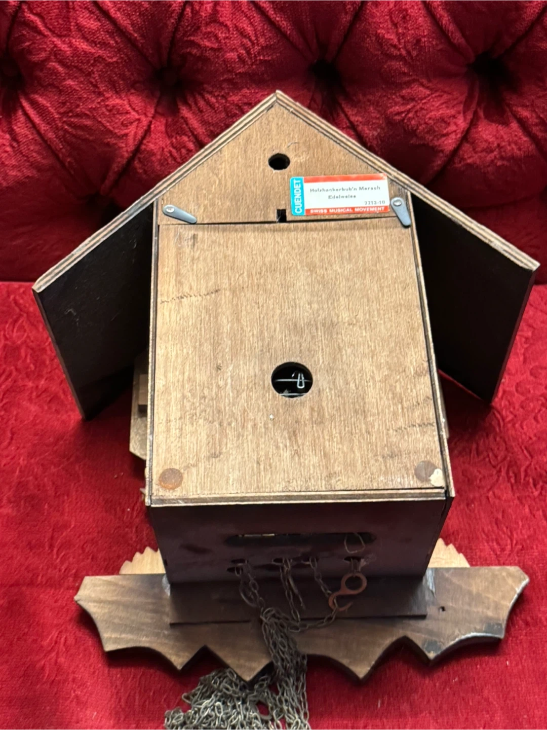 This is a charming vintage cuckoo clock featuring a Swiss musical movement by CUENDET. It plays 'Holzhackerbub'n Marsch' and 'Edelweiss'. The clock has a decorative front with painted flowers and two figurines. Includes pendulum and weights.