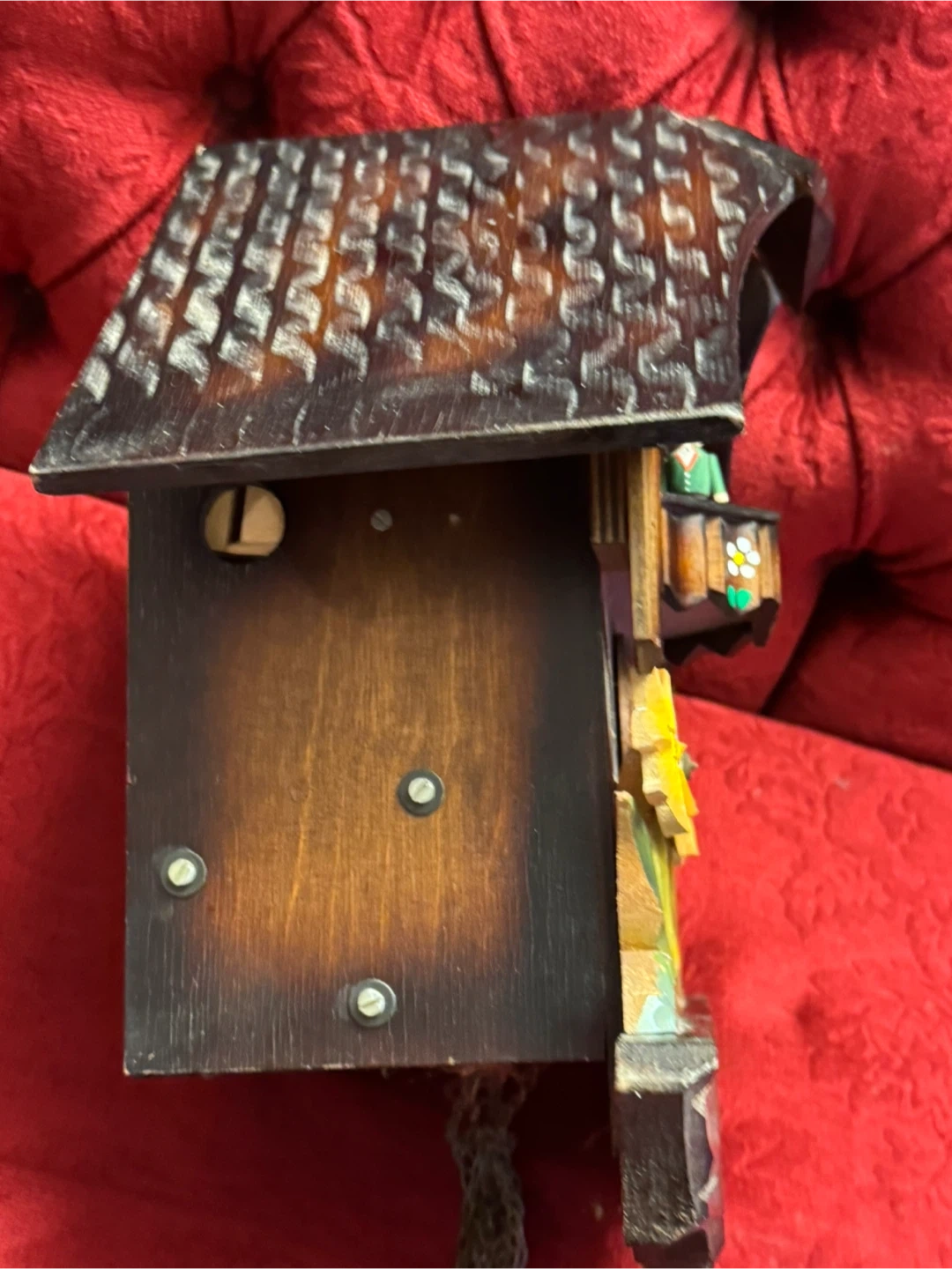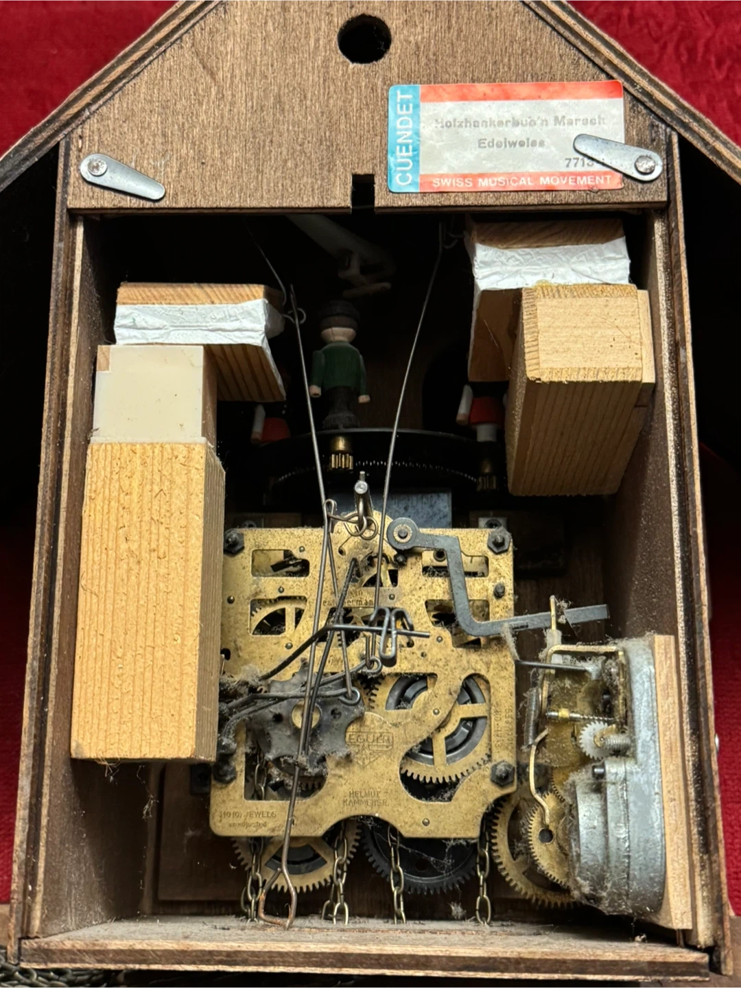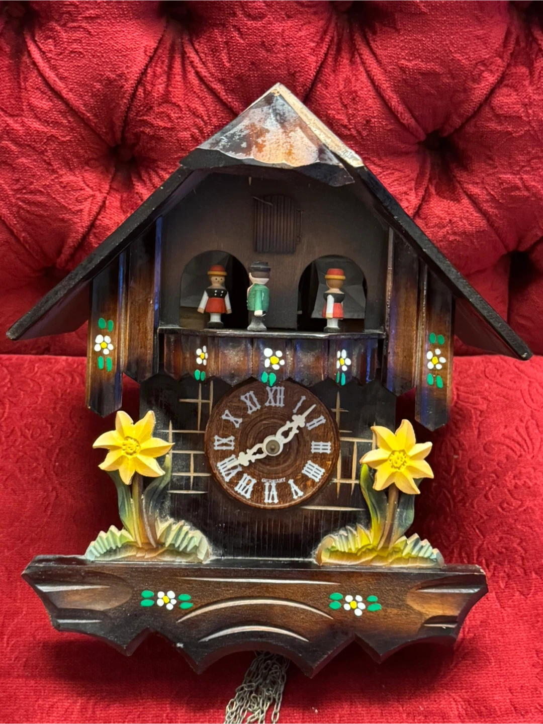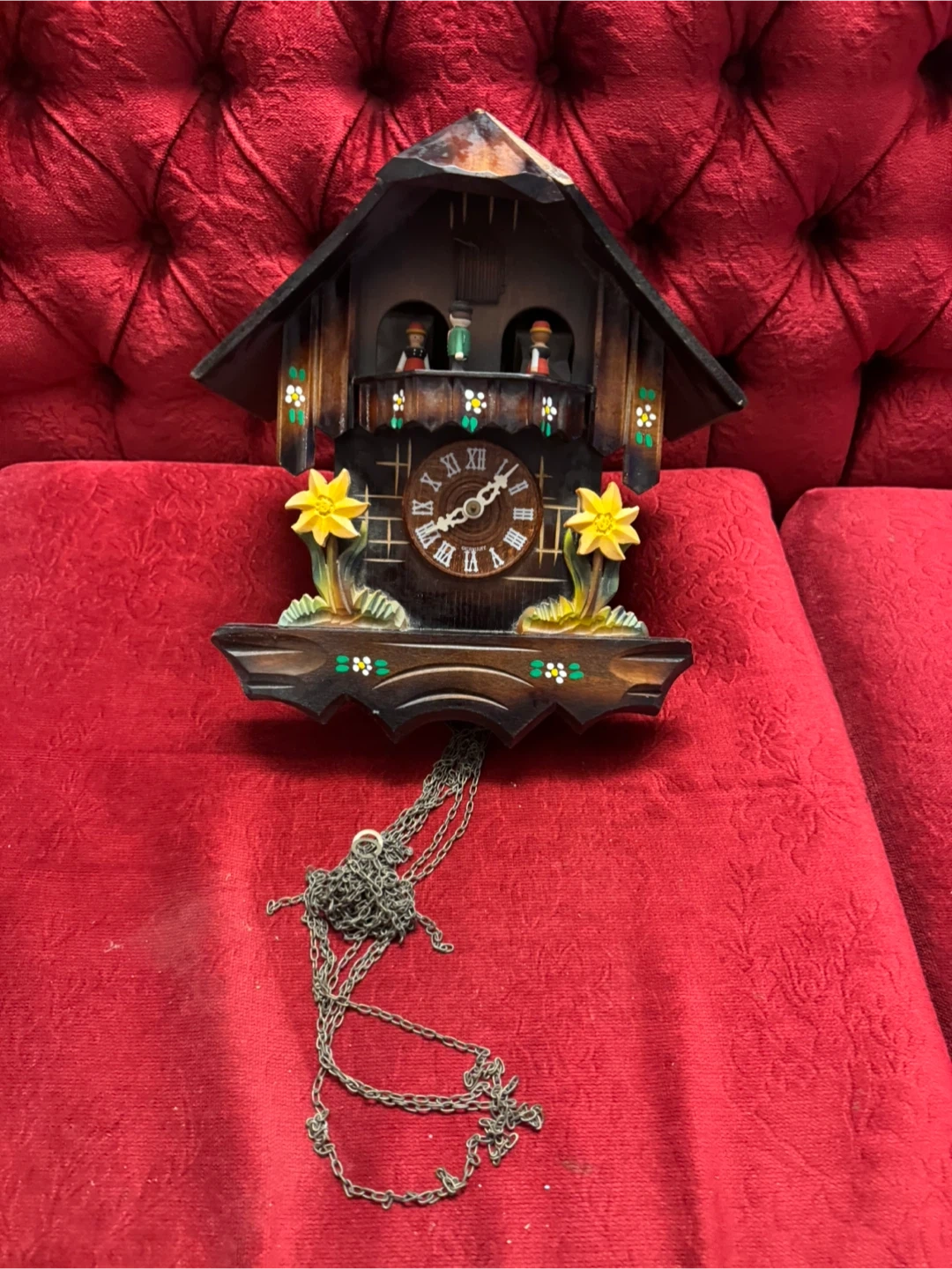 This is a charming vintage cuckoo clock featuring a Swiss musical movement by CUENDET. It plays 'Holzhackerbub'n Marsch' and 'Edelweiss'. The clock has a decorative front with painted flowers and two figurines. Includes pendulum and weights.