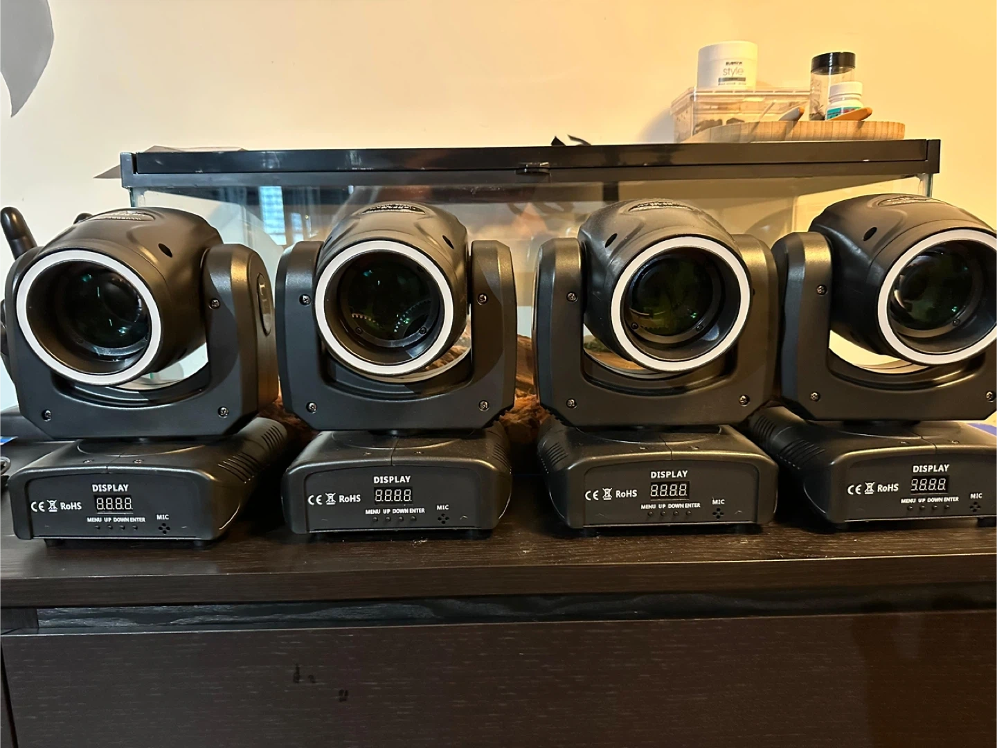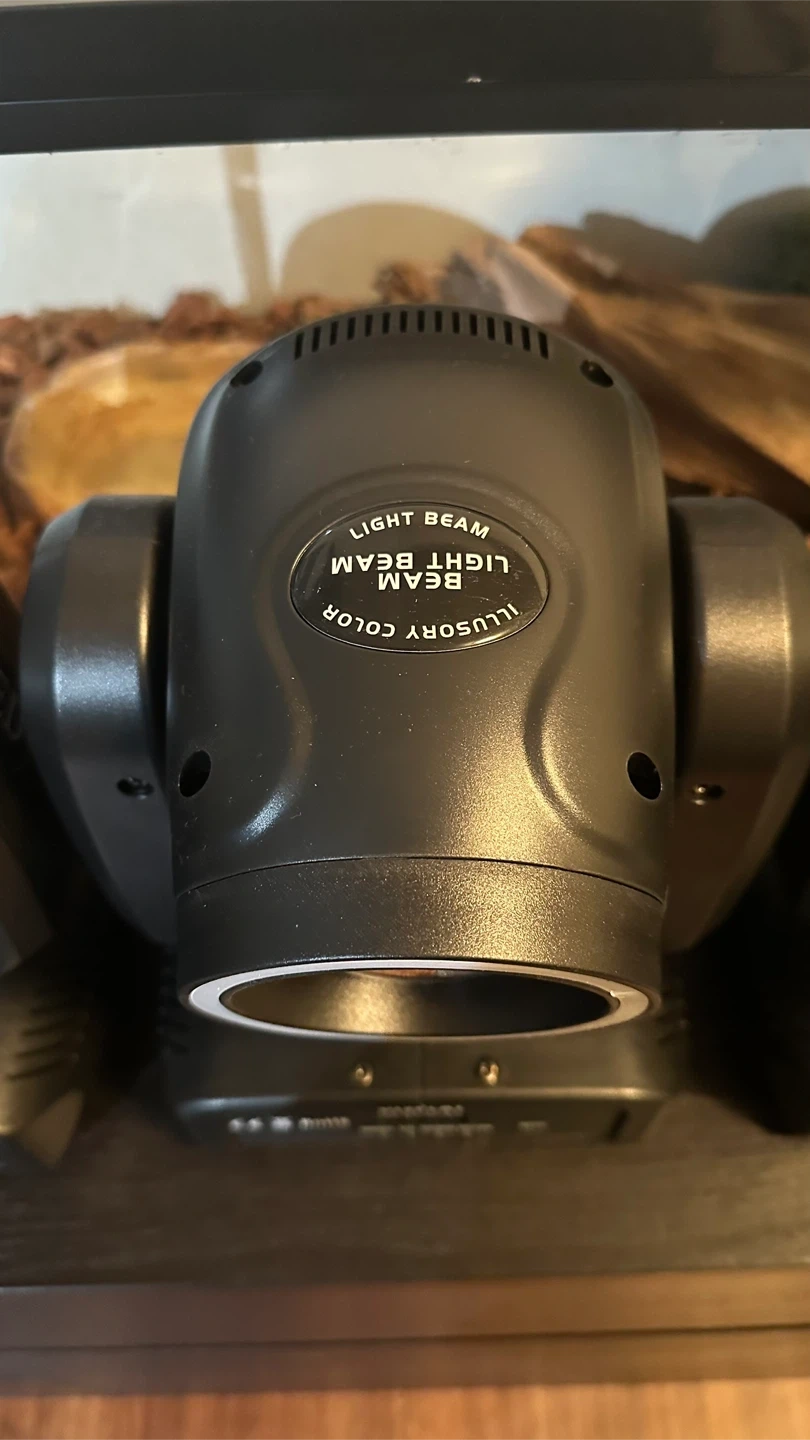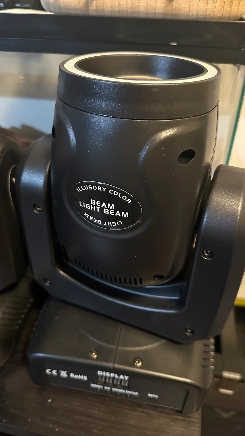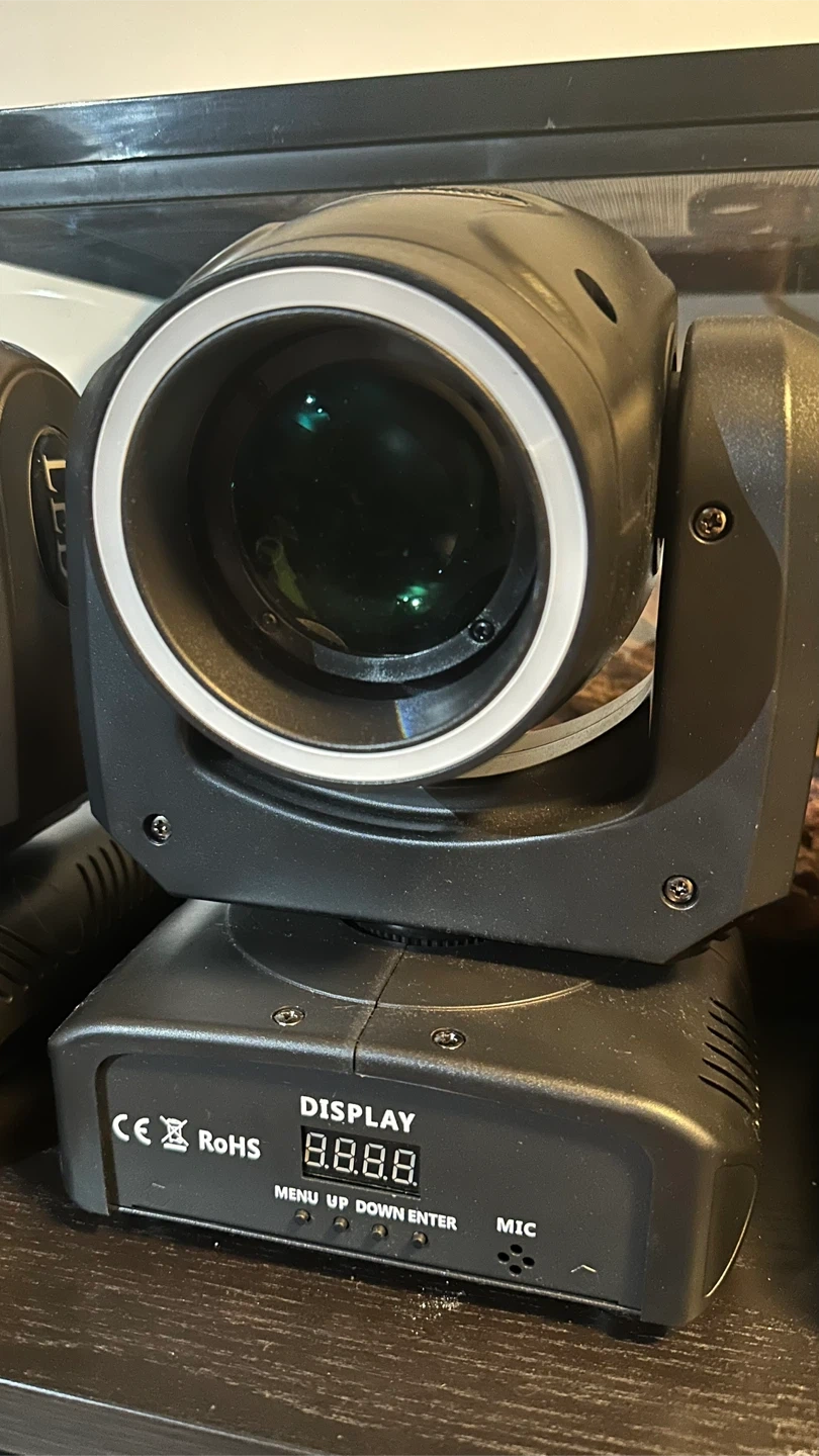 This moving head stage light produces a beam effect. It features adjustable settings and a microphone input for sound activation.