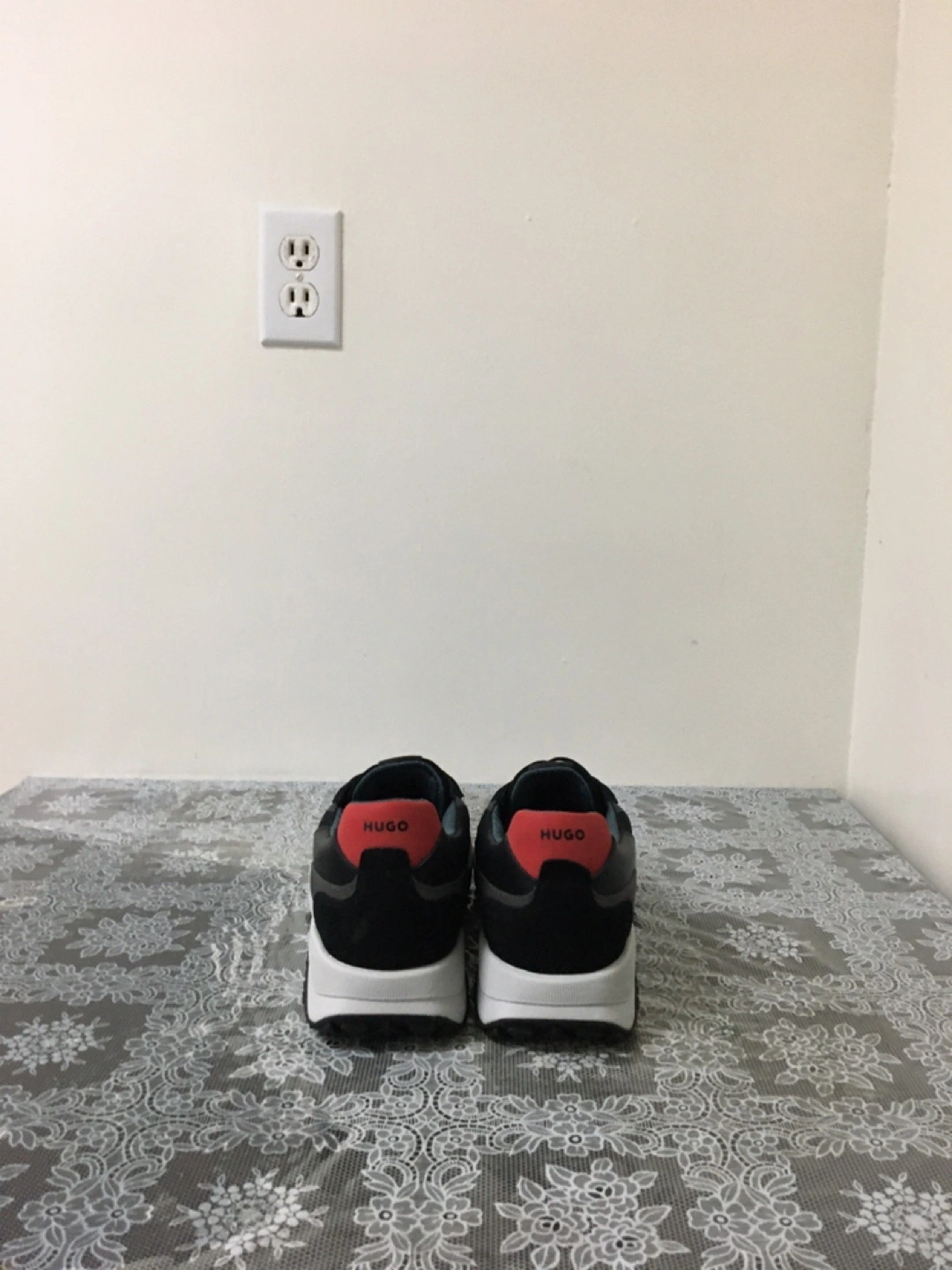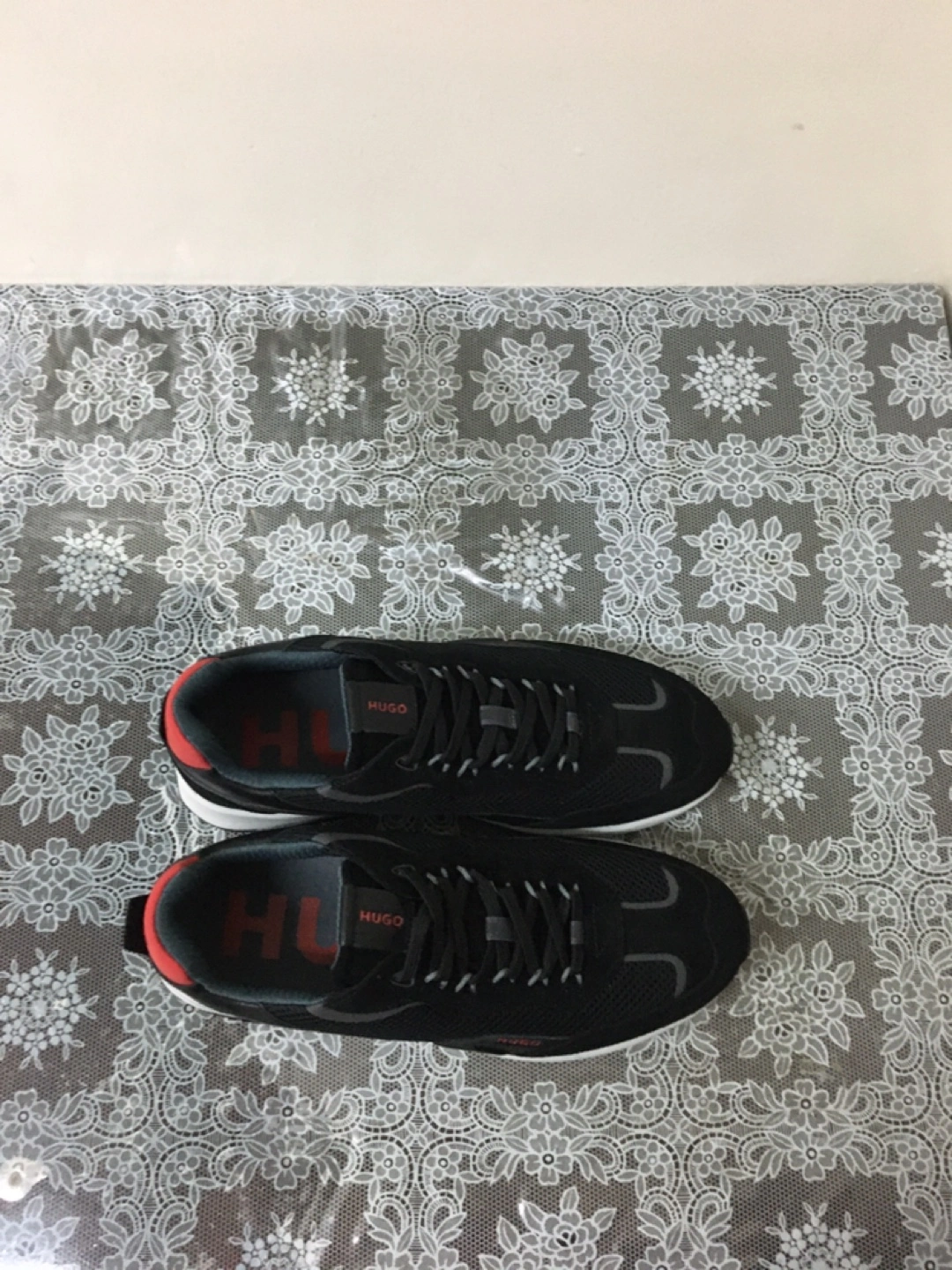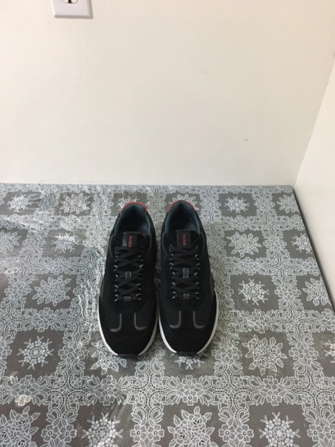 Hugo Boss men's sneakers in black. Features red accents on the heel tab. Lace-up closure with a durable rubber sole. These are great for casual wear! Pick up at steeles and Bathurst cash only