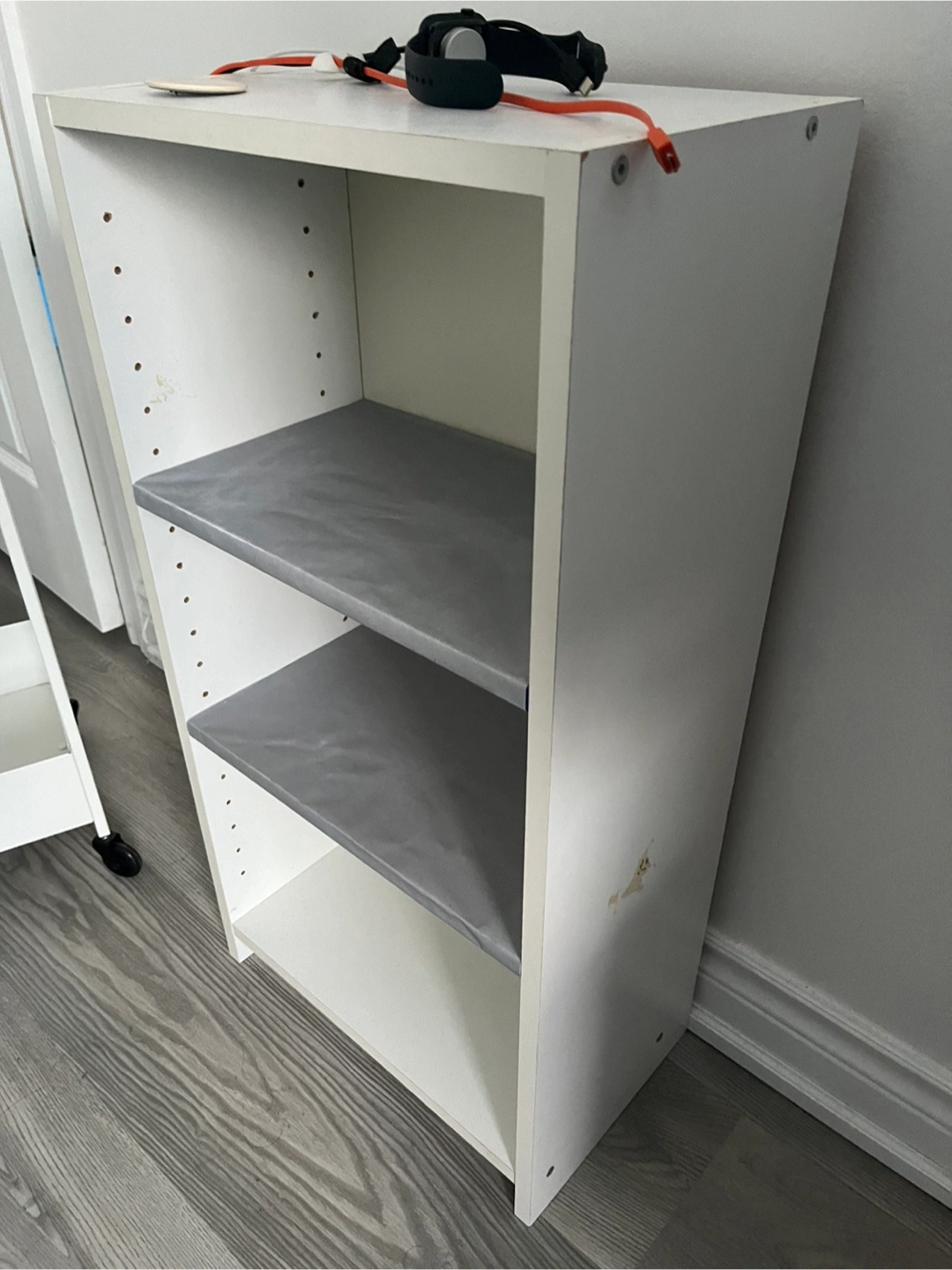 This is a white 3-shelf bookshelf.
