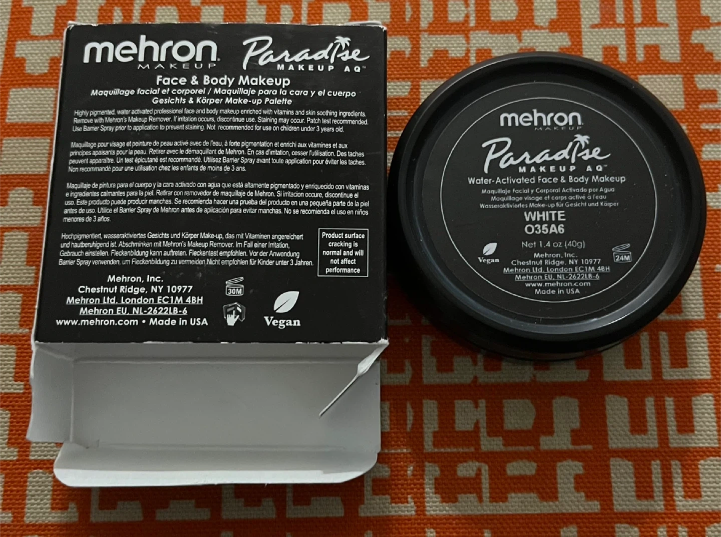 Mehron Makeup Paradise AQ Face & Body Makeup in White. This water-activated makeup is highly pigmented and uses a unique formula. It's smudgeproof once dry. 1.4 oz (40g) container.