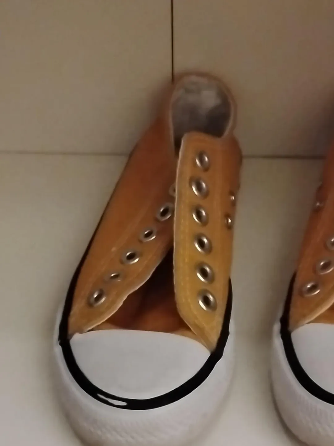 Classic Converse Chuck Taylor low-top sneakers in an orange canvas. Features a white rubber toe cap and laces.