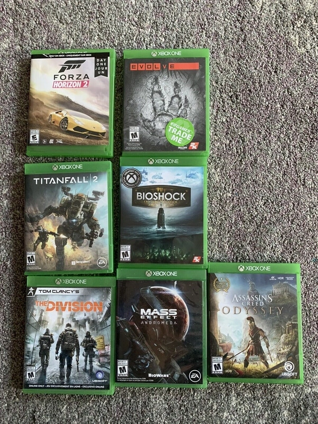 Games available: Forza Horizon 2, Evolve, Titanfall 2, Bioshock Collection, The Division, Mass Effect Andromeda, Assassin's Creed Odyssey. Email, text, or call 519-702-4490. Trades considered.