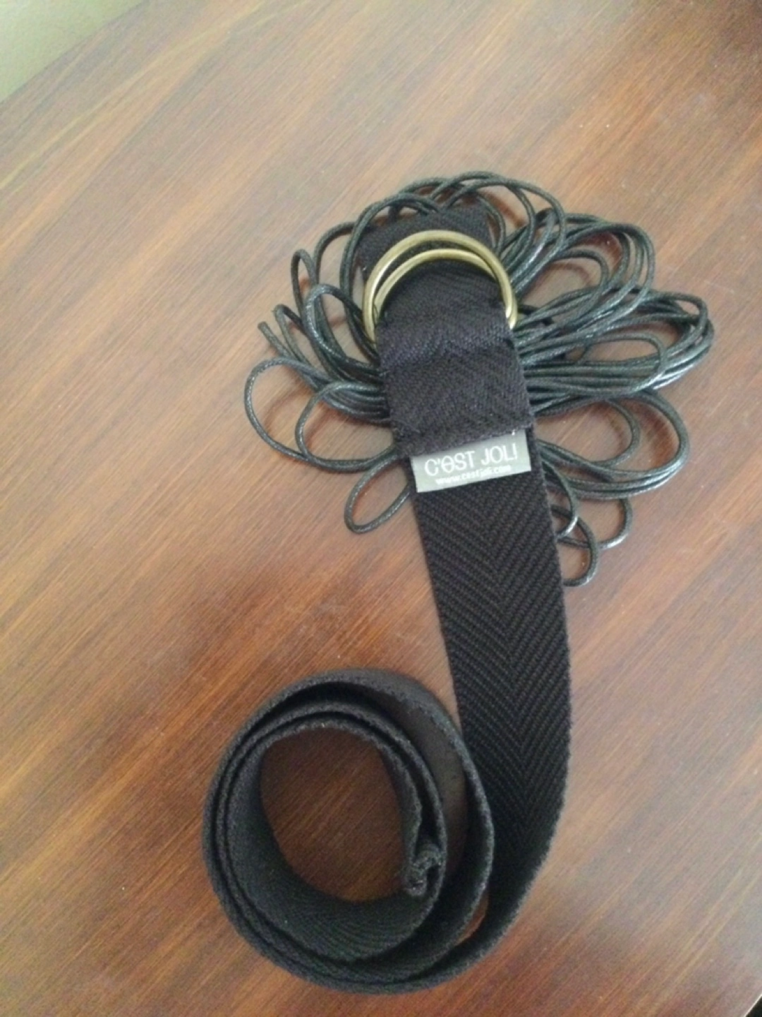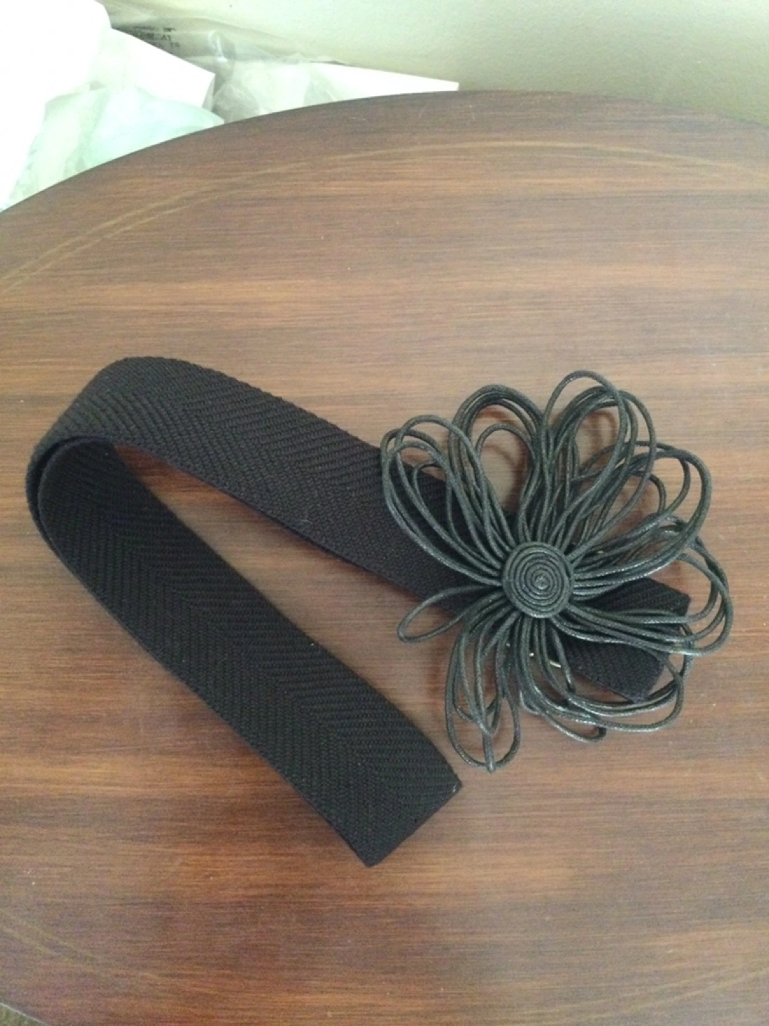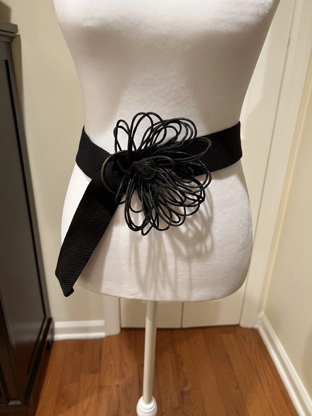 Black fabric belt with leather flower at buckle, ring style closure. Like new in extremely mint condition.