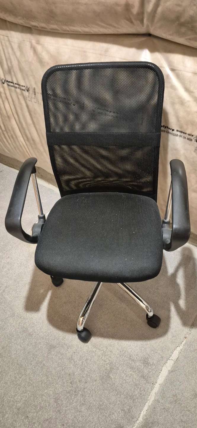 This black mesh office chair offers comfortable seating with adjustable armrests. It features a sturdy base with wheels for easy mobility.