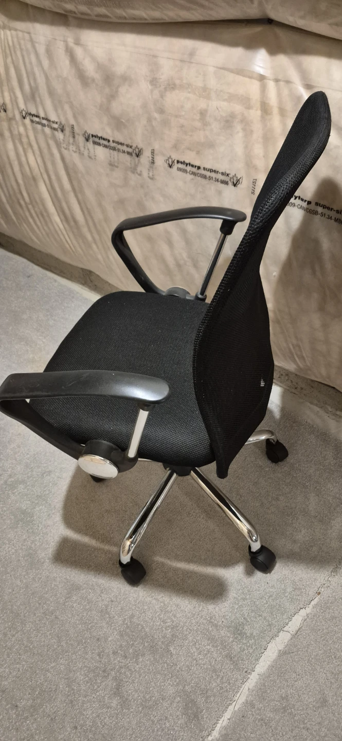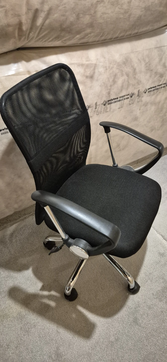 This black mesh office chair offers comfortable seating with adjustable armrests. It features a sturdy base with wheels for easy mobility.