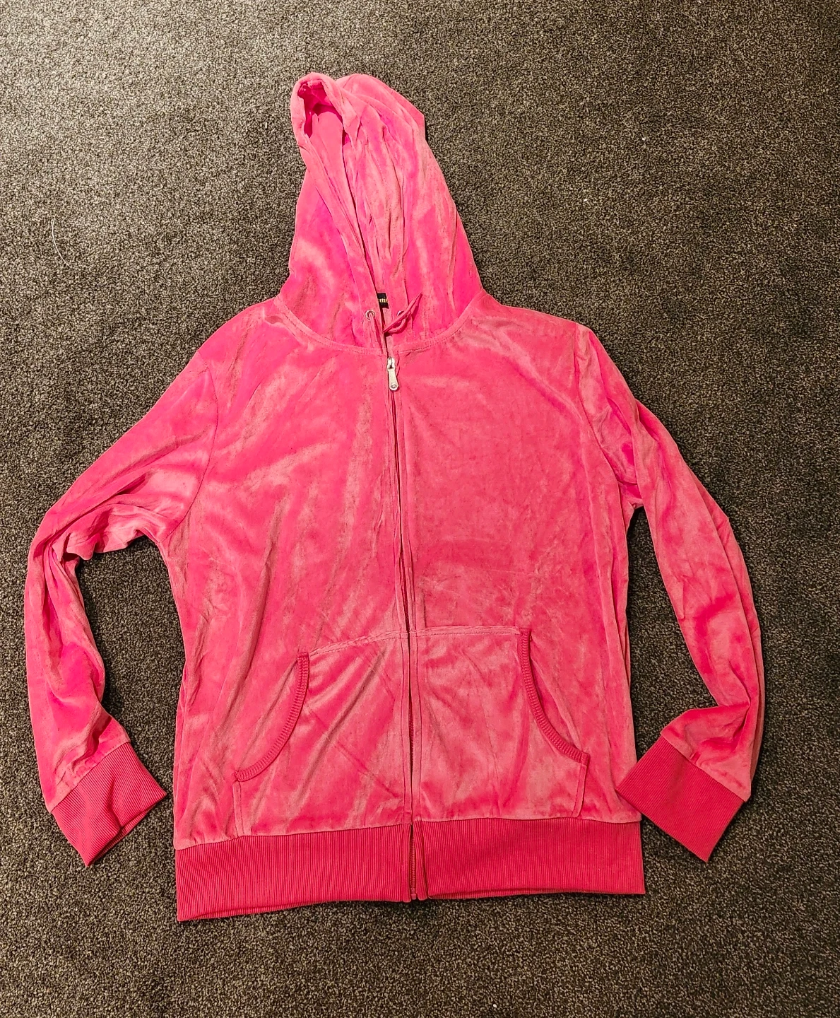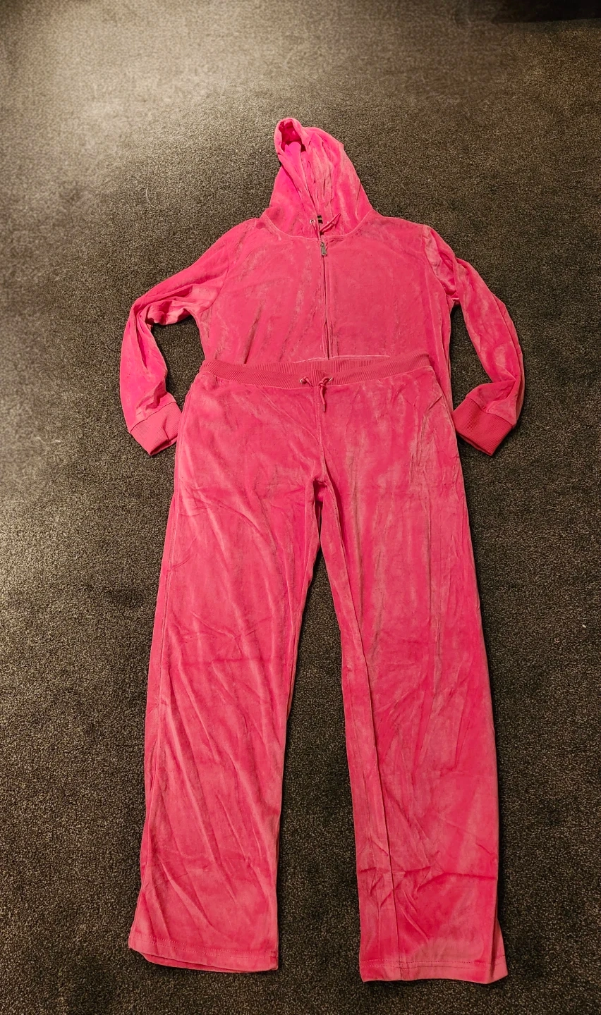 A cozy pink velour tracksuit set with a zip-up hoodie and matching pants. It's made of soft velour material. This set is comfy for lounging or casual outings!