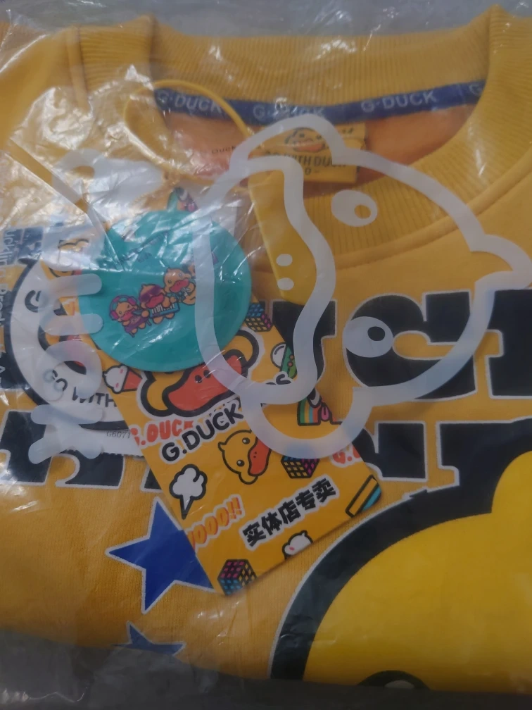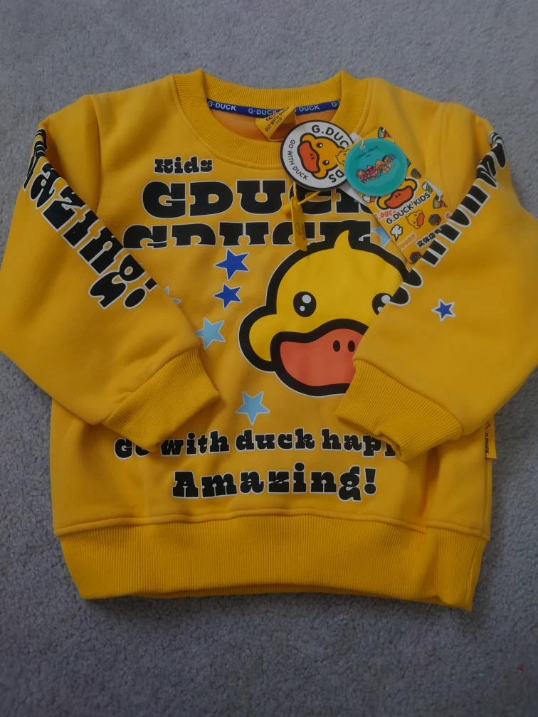 A cute and cozy yellow sweatshirt from G.Duck Kids! It features a fun duck design and says "Go with duck happy, amazing!" It's perfect for keeping your little one warm and stylish