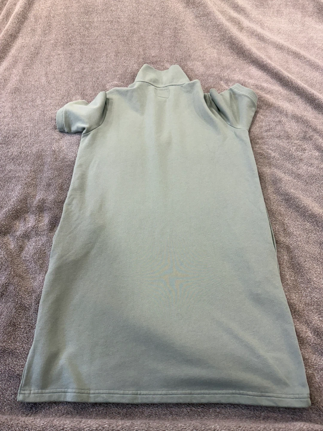 A Roots quarter zip sweatshirt dress in a light green colour. It features short sleeves and a high collar with a zip closure. Made from a comfortable, soft material. This dress is size S/P.
