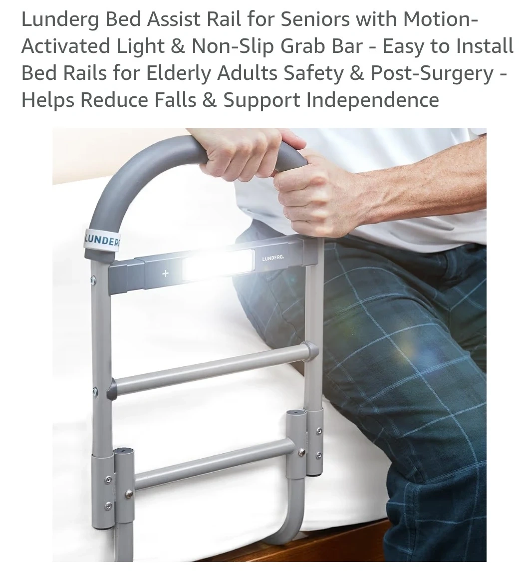 This Lundberg bed rail features a motion-activated safety light that turns on automatically. It's designed for easy, tool-free installation and offers a slip-resistant handle. Available in 13" and 17.5" sizes, it fits most bed frames with a firm under-mattress support. It's ideal for seniors or anyone needing extra stability getting in and out of bed.
