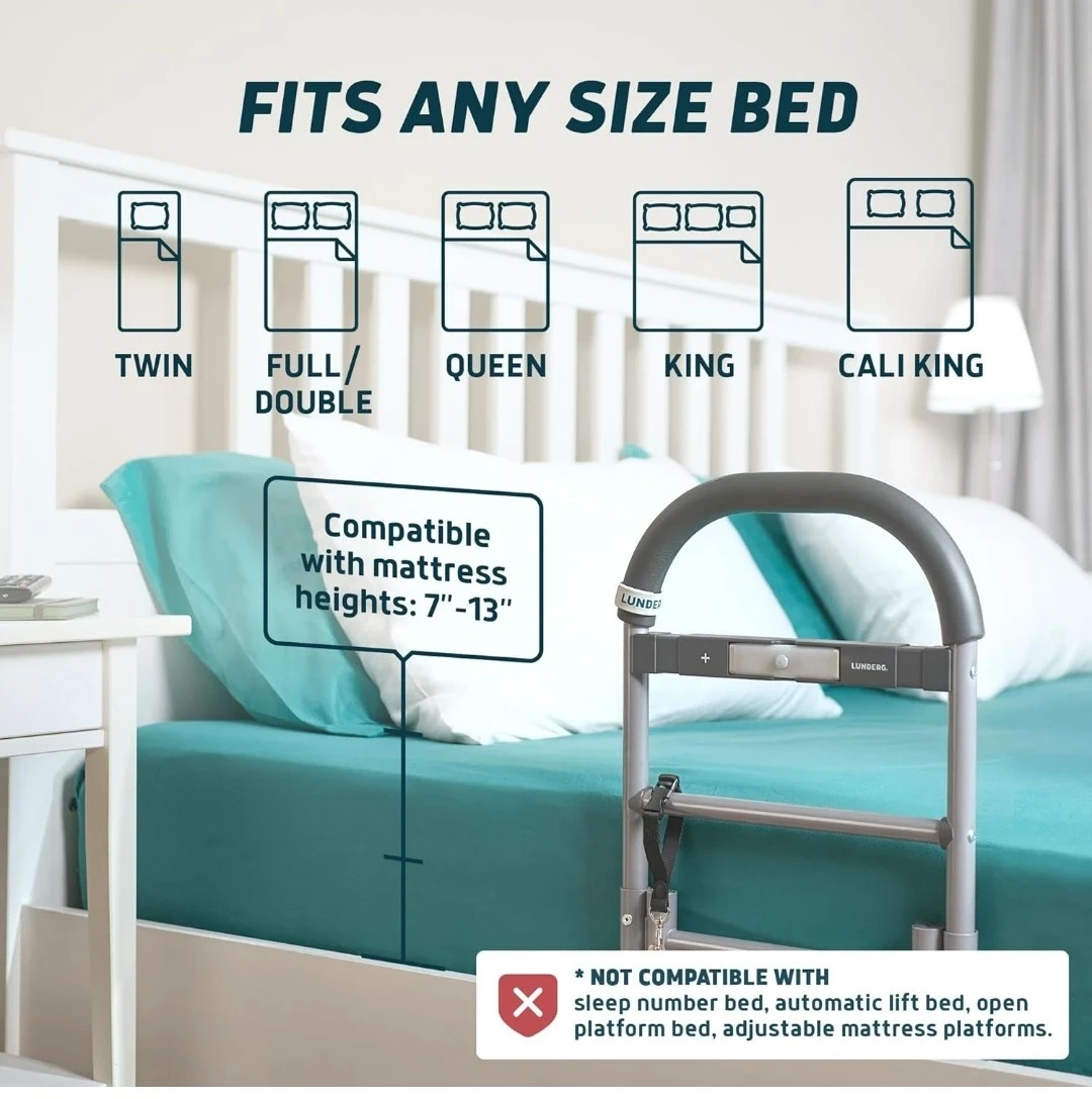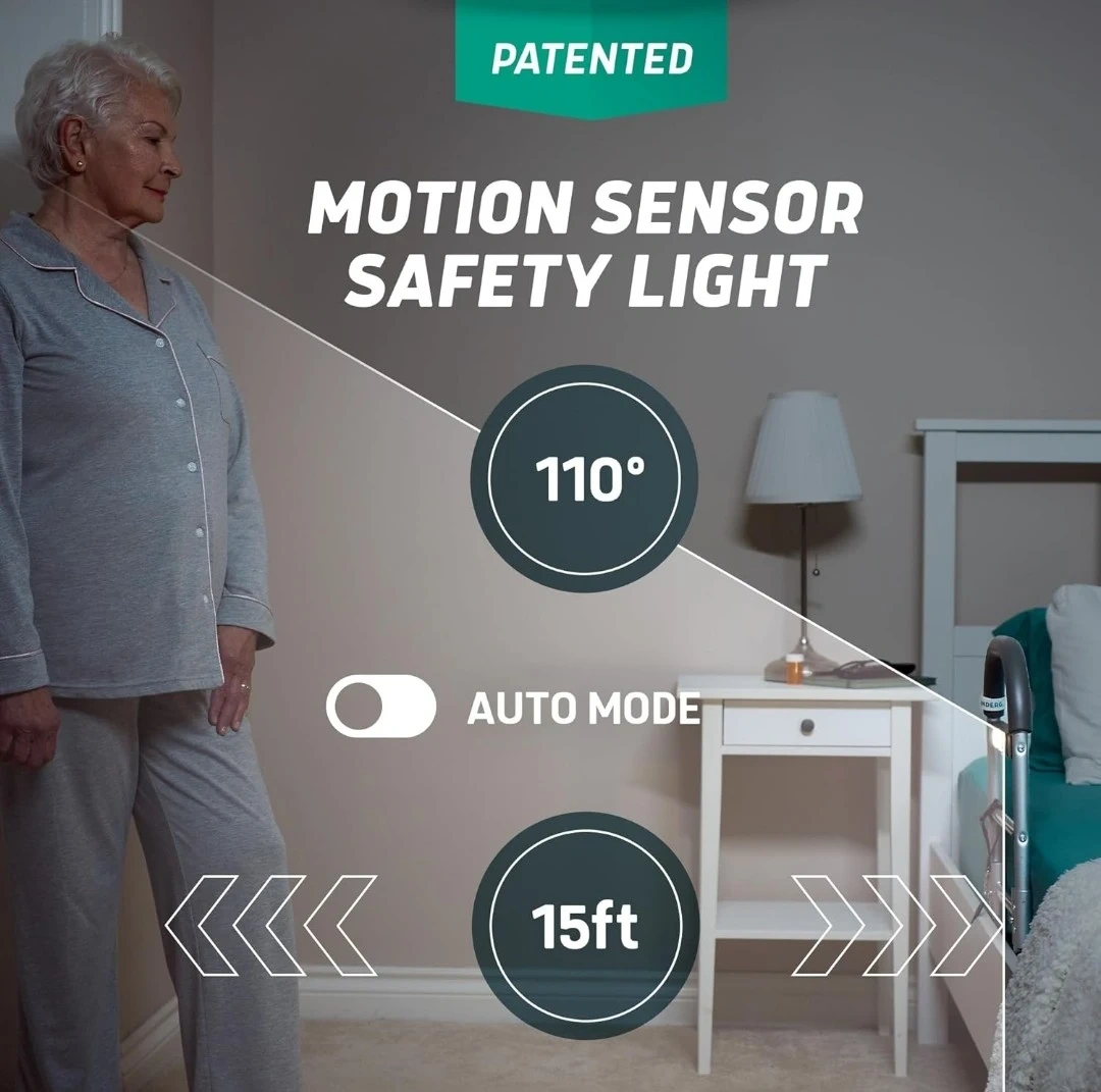 This Lundberg bed rail features a motion-activated safety light that turns on automatically. It's designed for easy, tool-free installation and offers a slip-resistant handle. Available in 13" and 17.5" sizes, it fits most bed frames with a firm under-mattress support. It's ideal for seniors or anyone needing extra stability getting in and out of bed.
