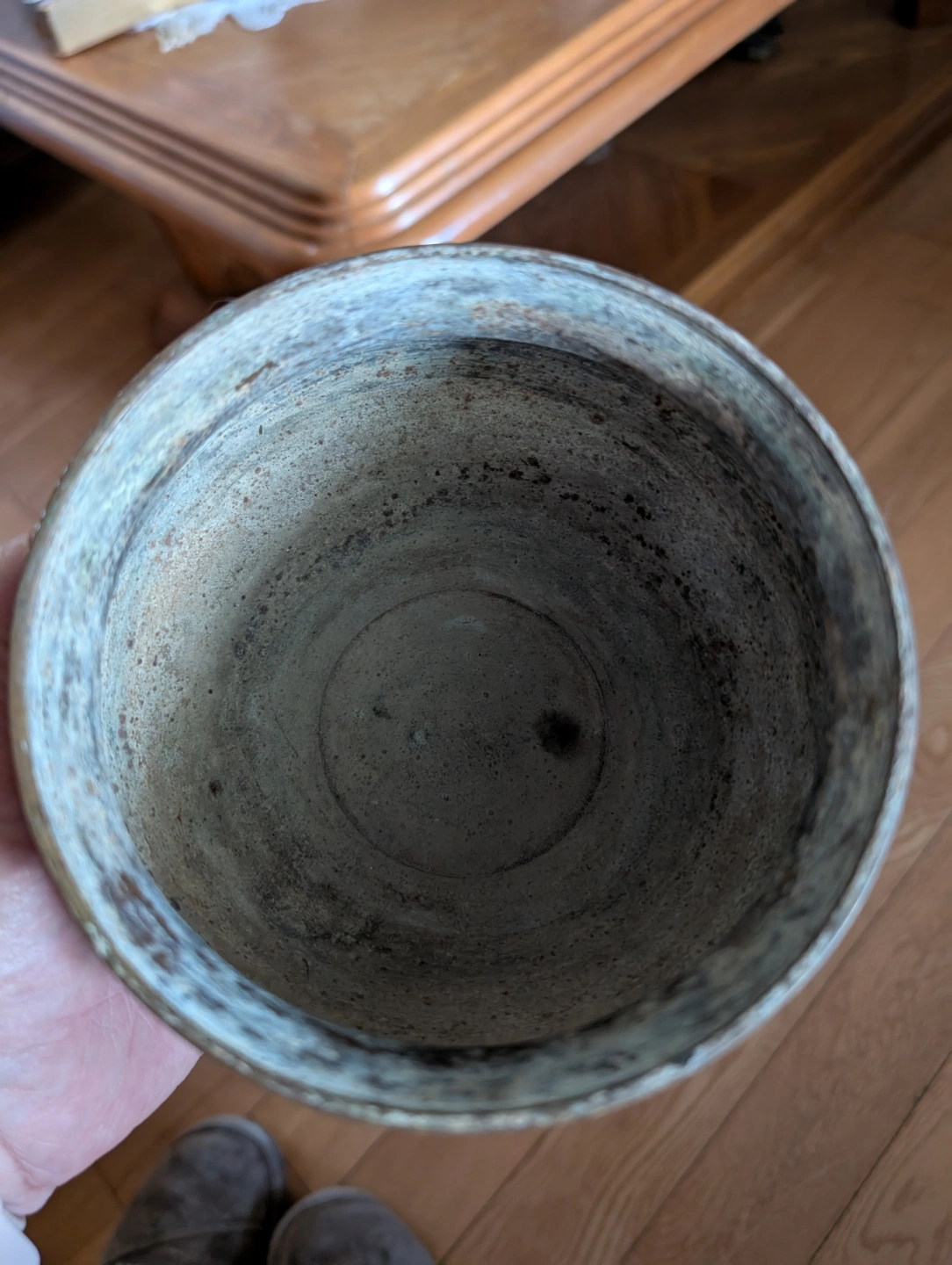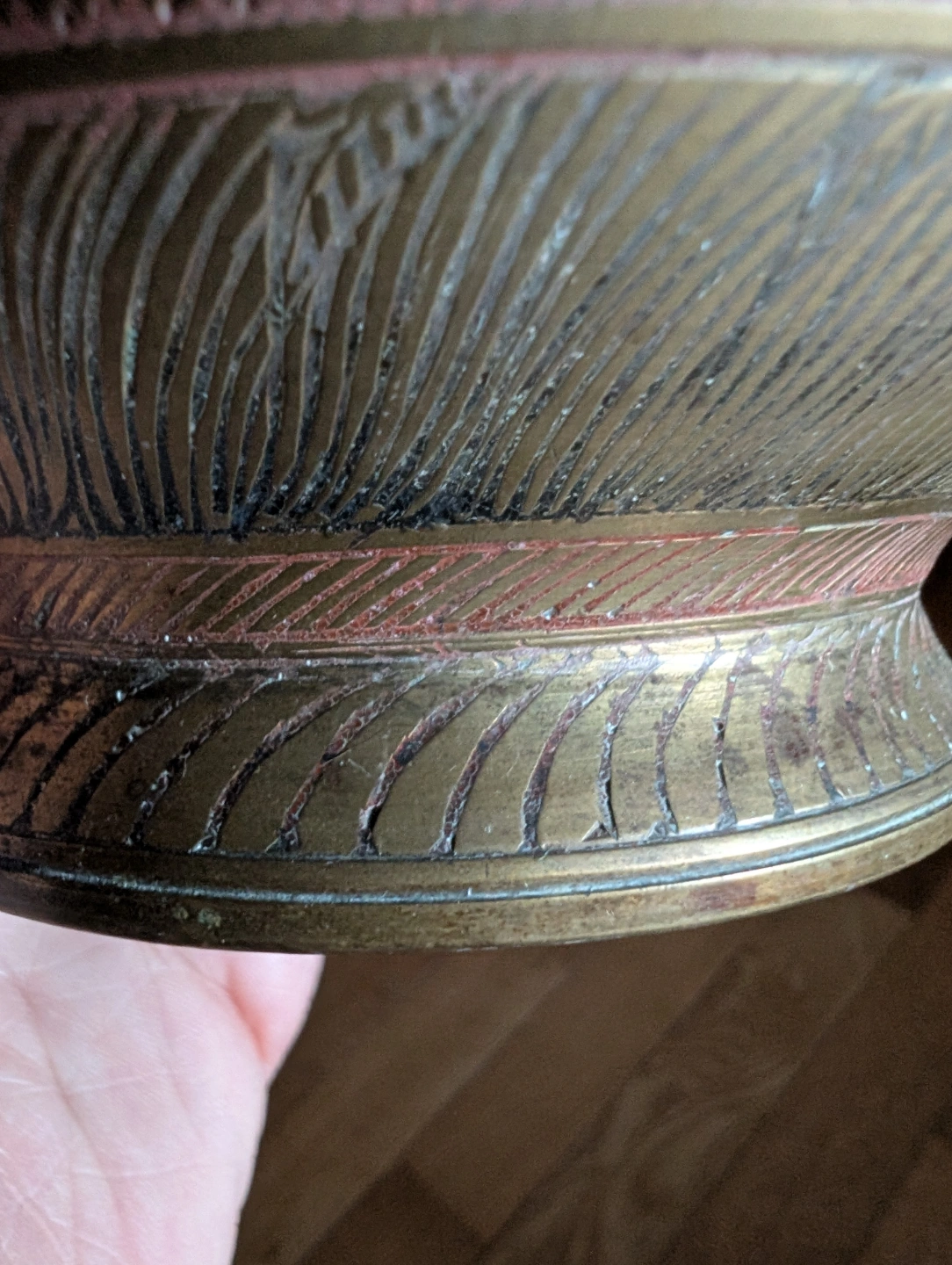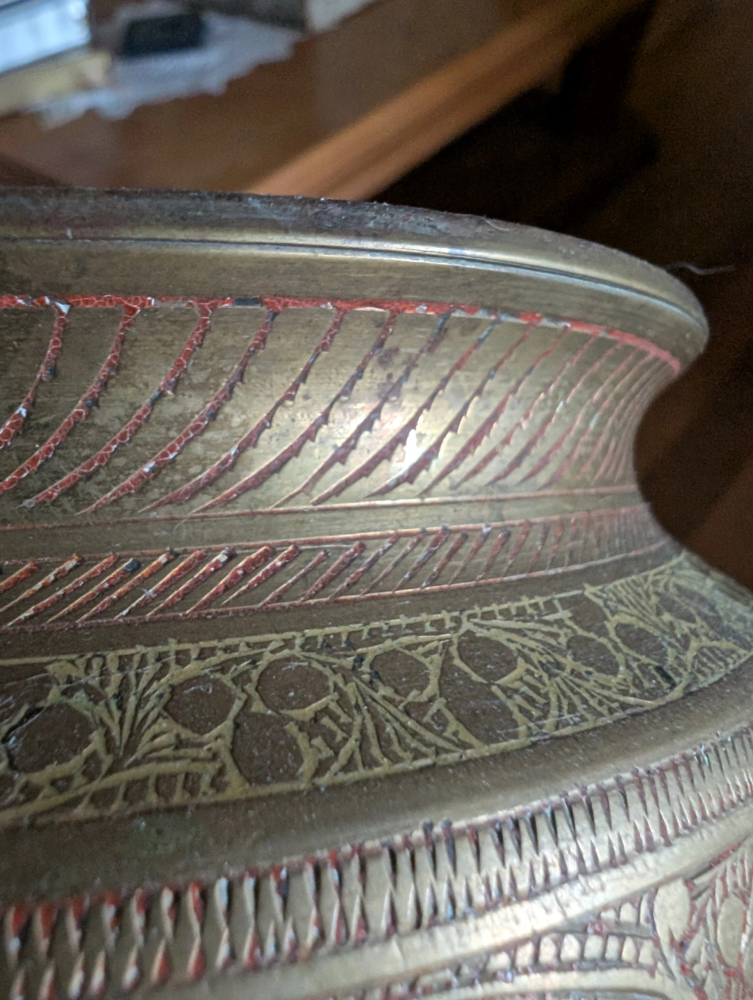 Ornate brass pot. Features engraved floral patterns. Beautiful colours. Unique piece for home décor. Shows some wear consistent with age.