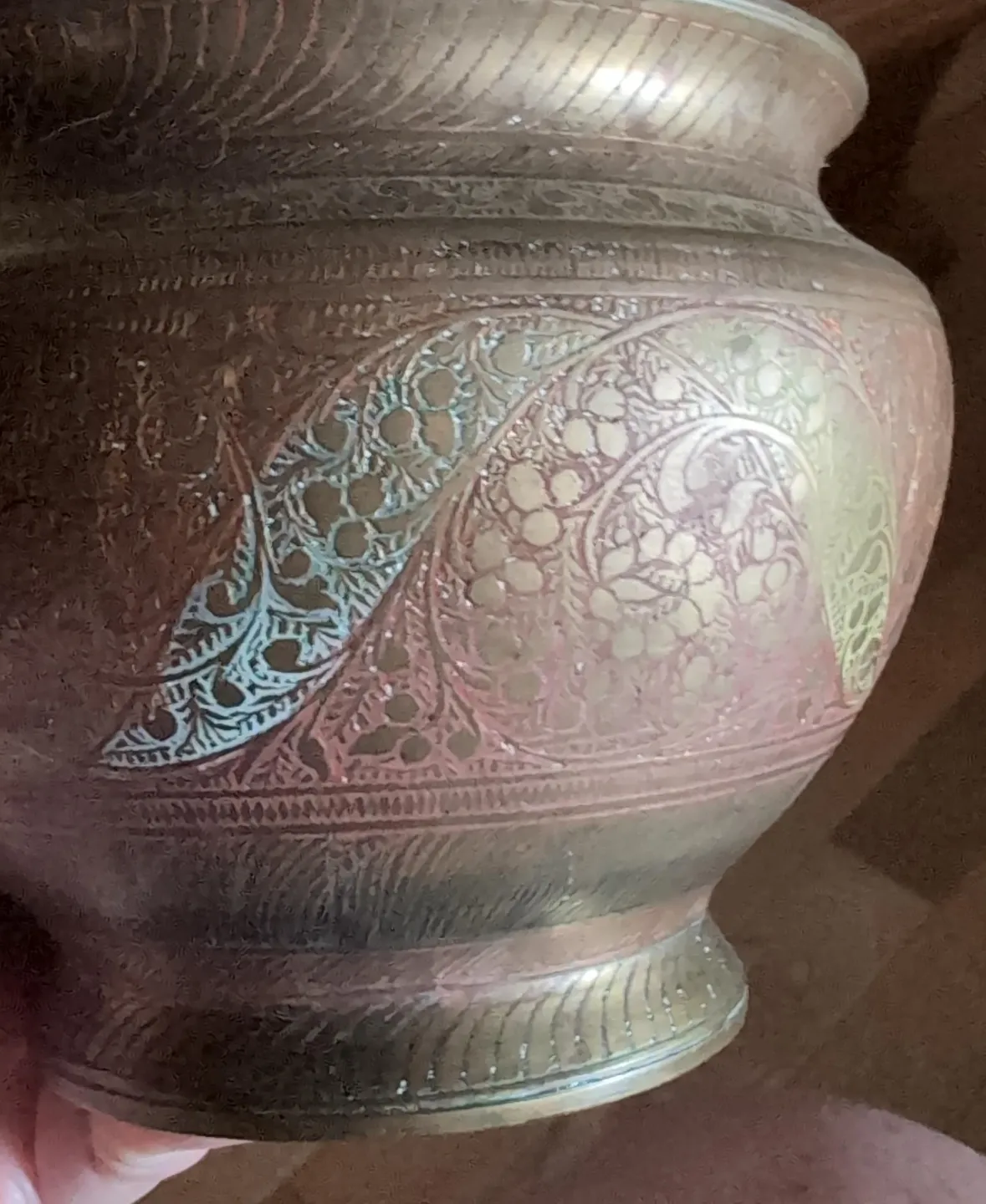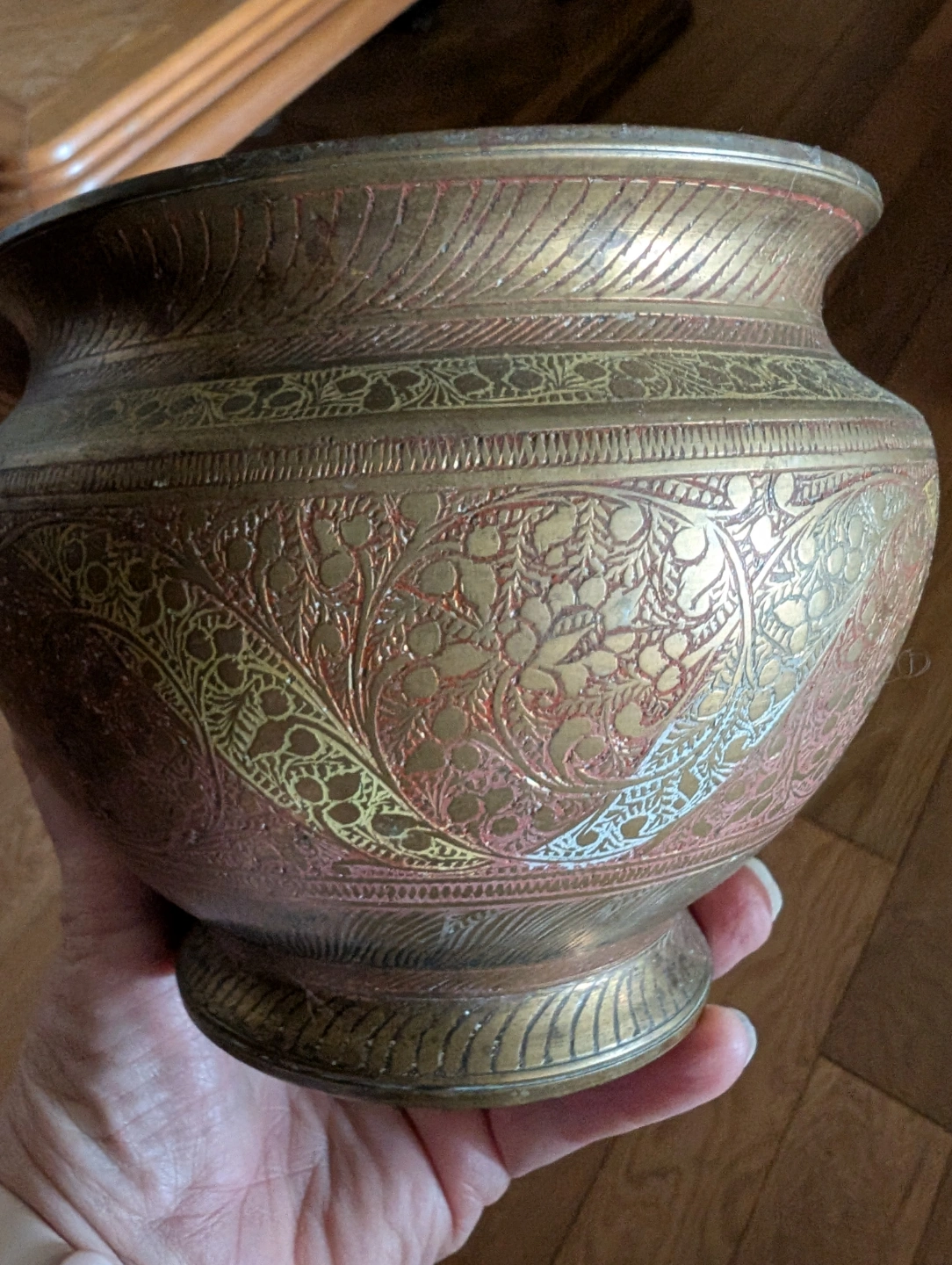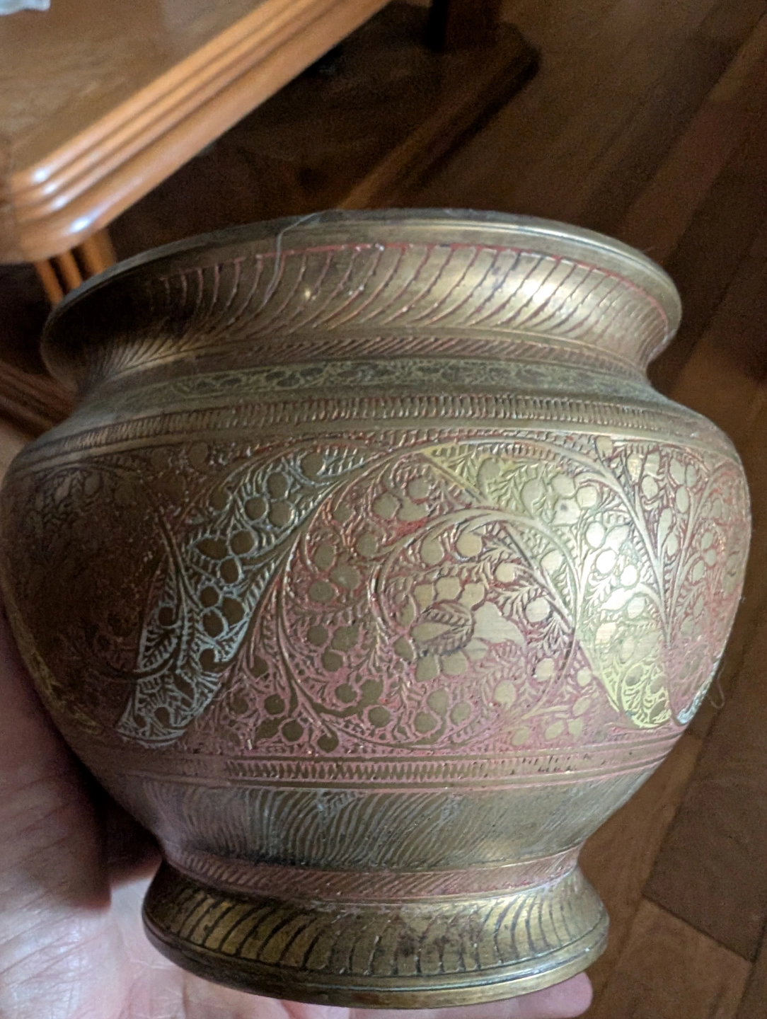 Ornate brass pot. Features engraved floral patterns. Beautiful colours. Unique piece for home décor. Shows some wear consistent with age.