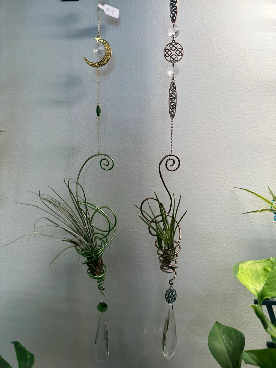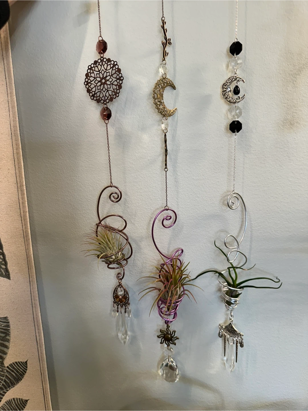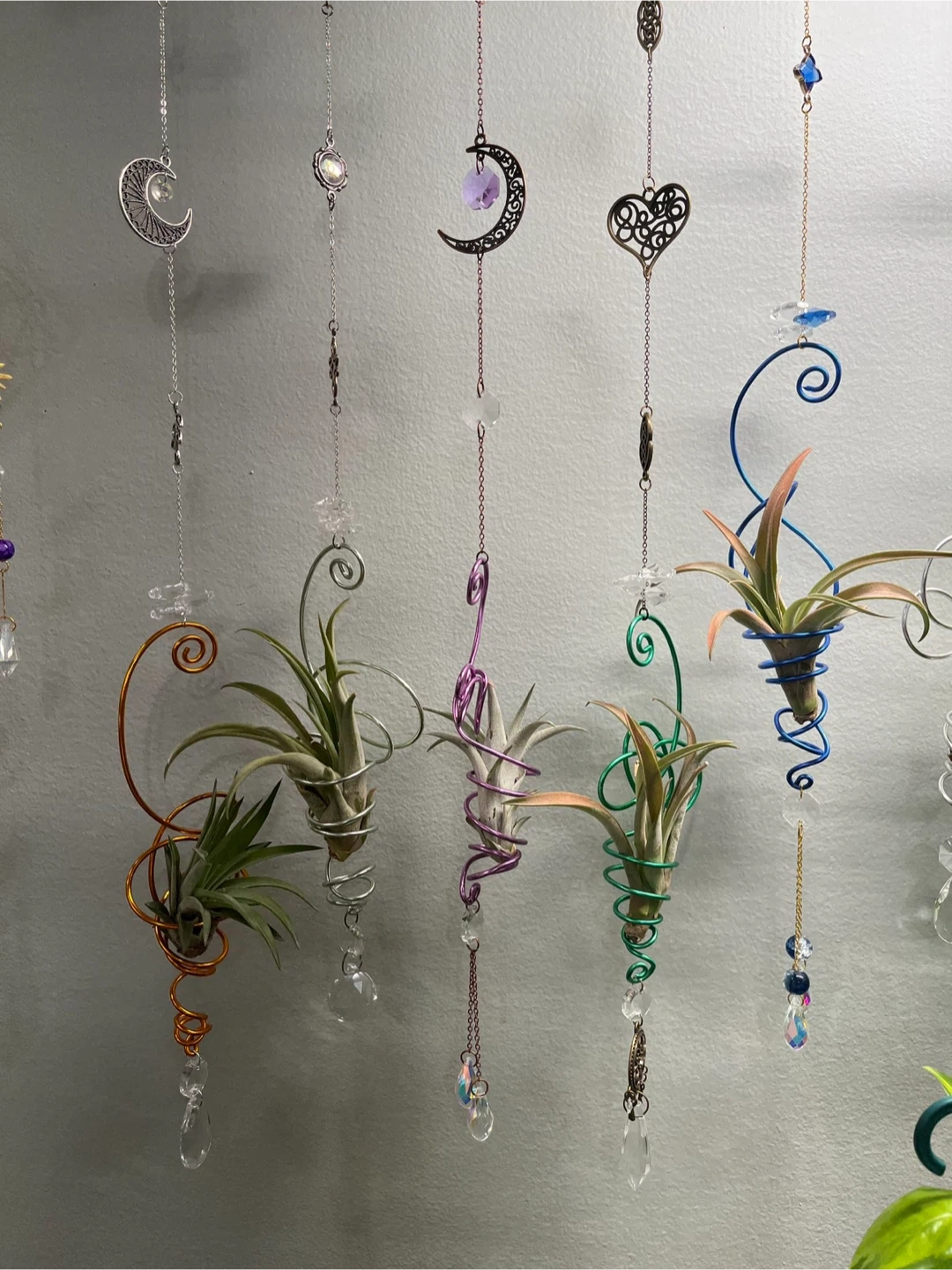 Variety of unique hanging Suncatchers, each holding a live Airplant. The suncatchers come in either Silver, Gold, Copper or Bronze chain complimented with a variety of charms, crystals and metal wire
