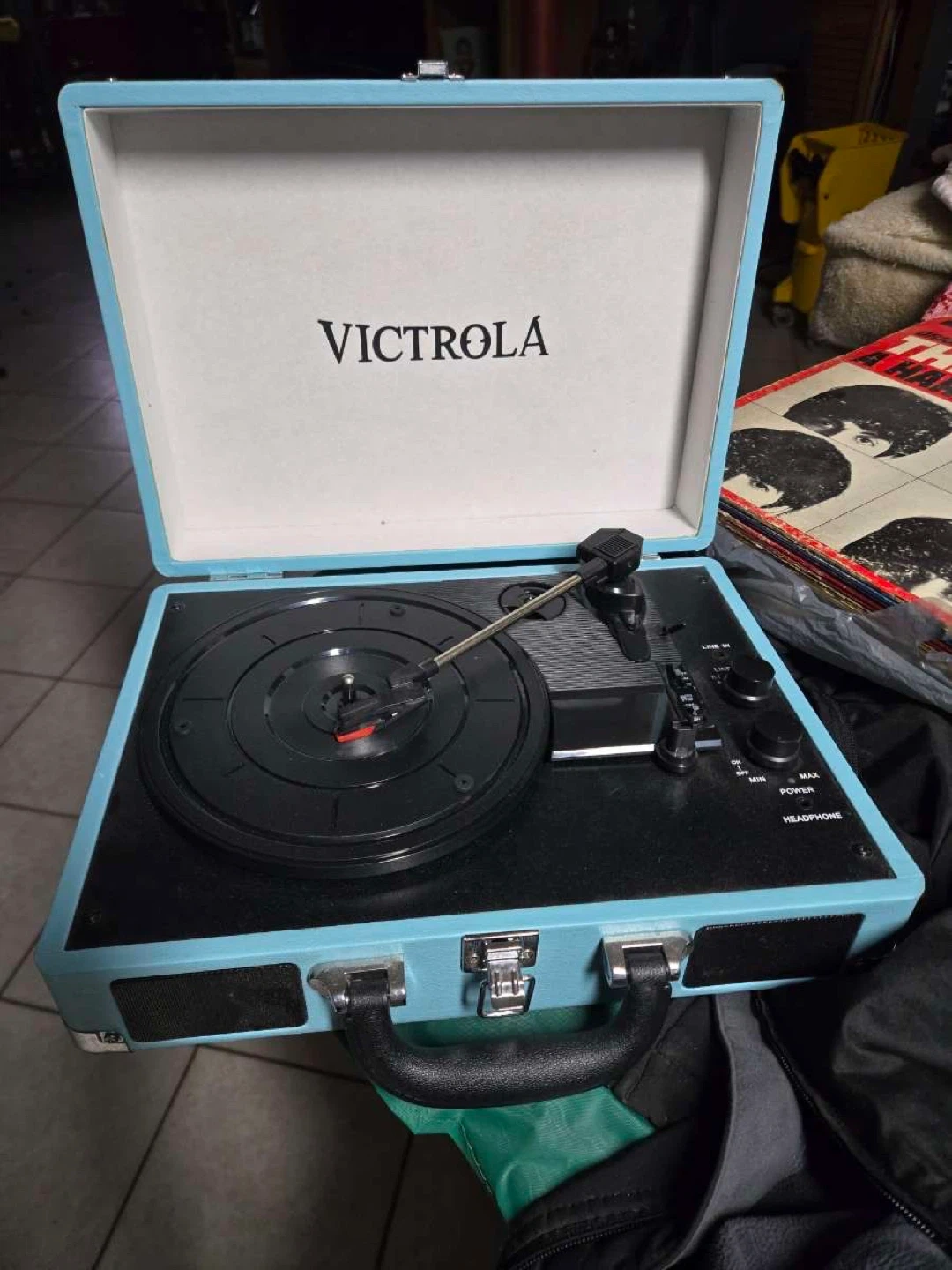 Victrola portable record player in a light blue colour! It's a 3-speed turntable with built-in speakers. Includes a headphone jack for private listening. Great for spinning your favourite vinyl!