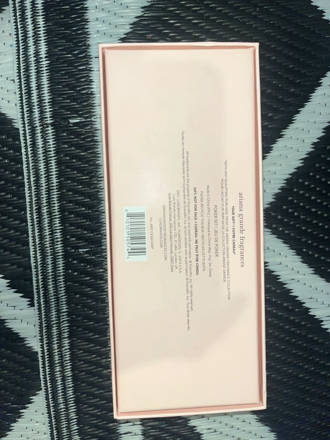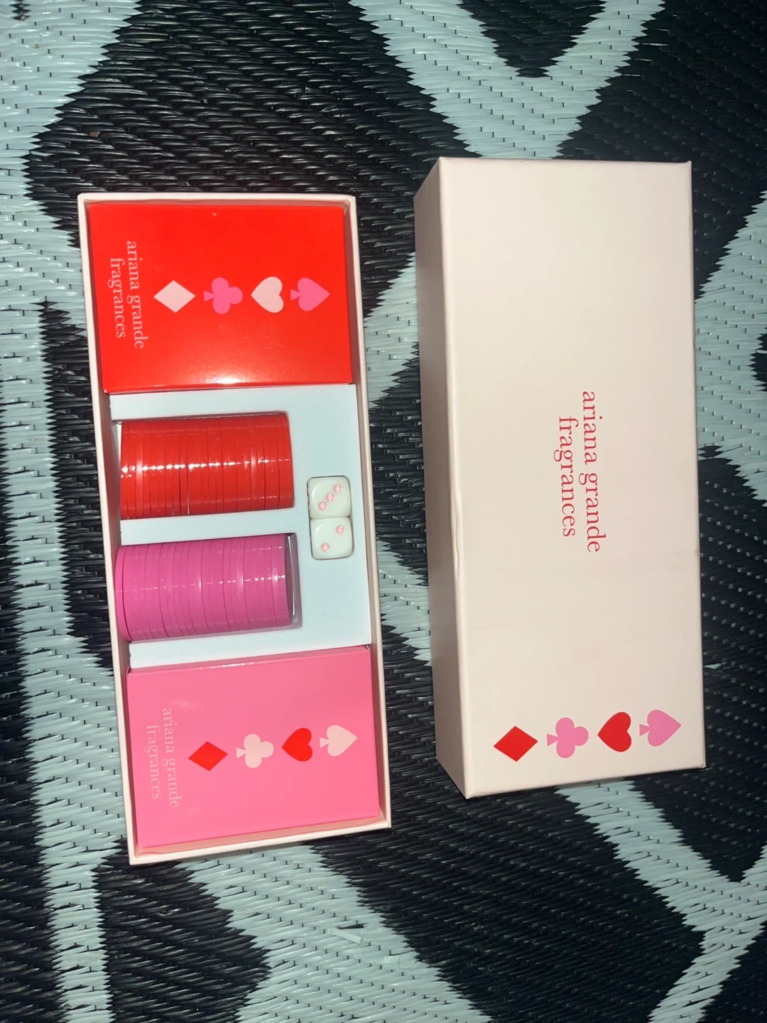This is the Ariana Grande Fragrances poker set. It includes poker chips and dice, all housed in a decorative box. Great for a fan of Ariana Grande!