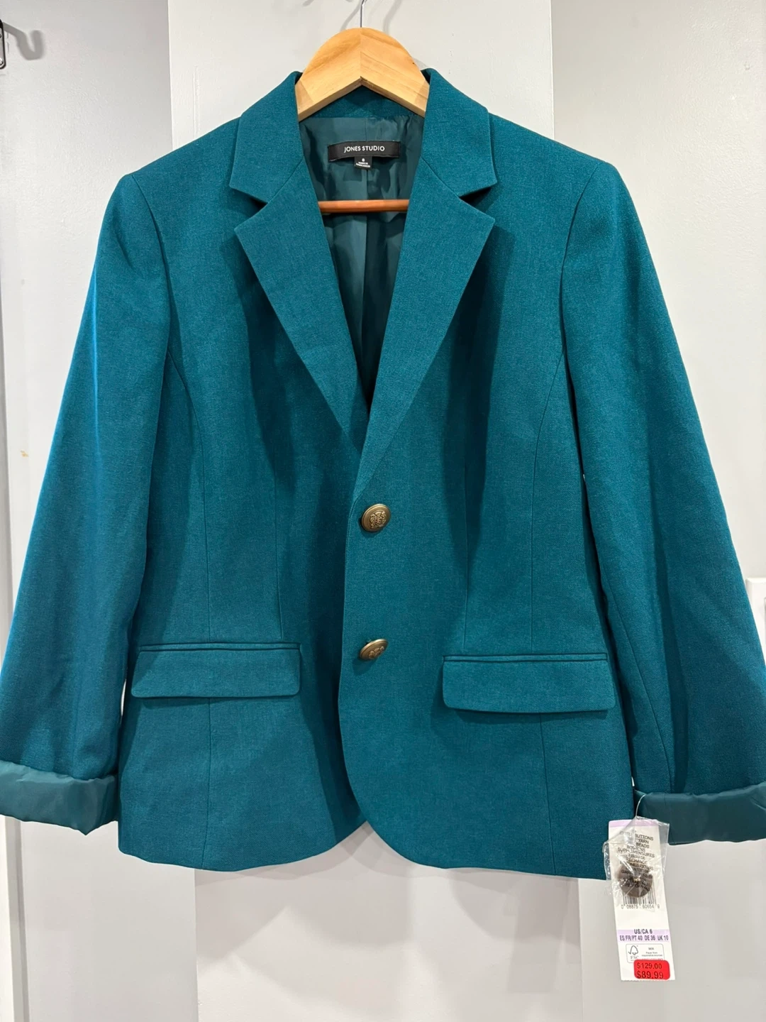 This Jones Studio blazer is a lovely teal colour. It's a size 6 with two buttons in the front. The material appears to be a blend, suitable for layering.