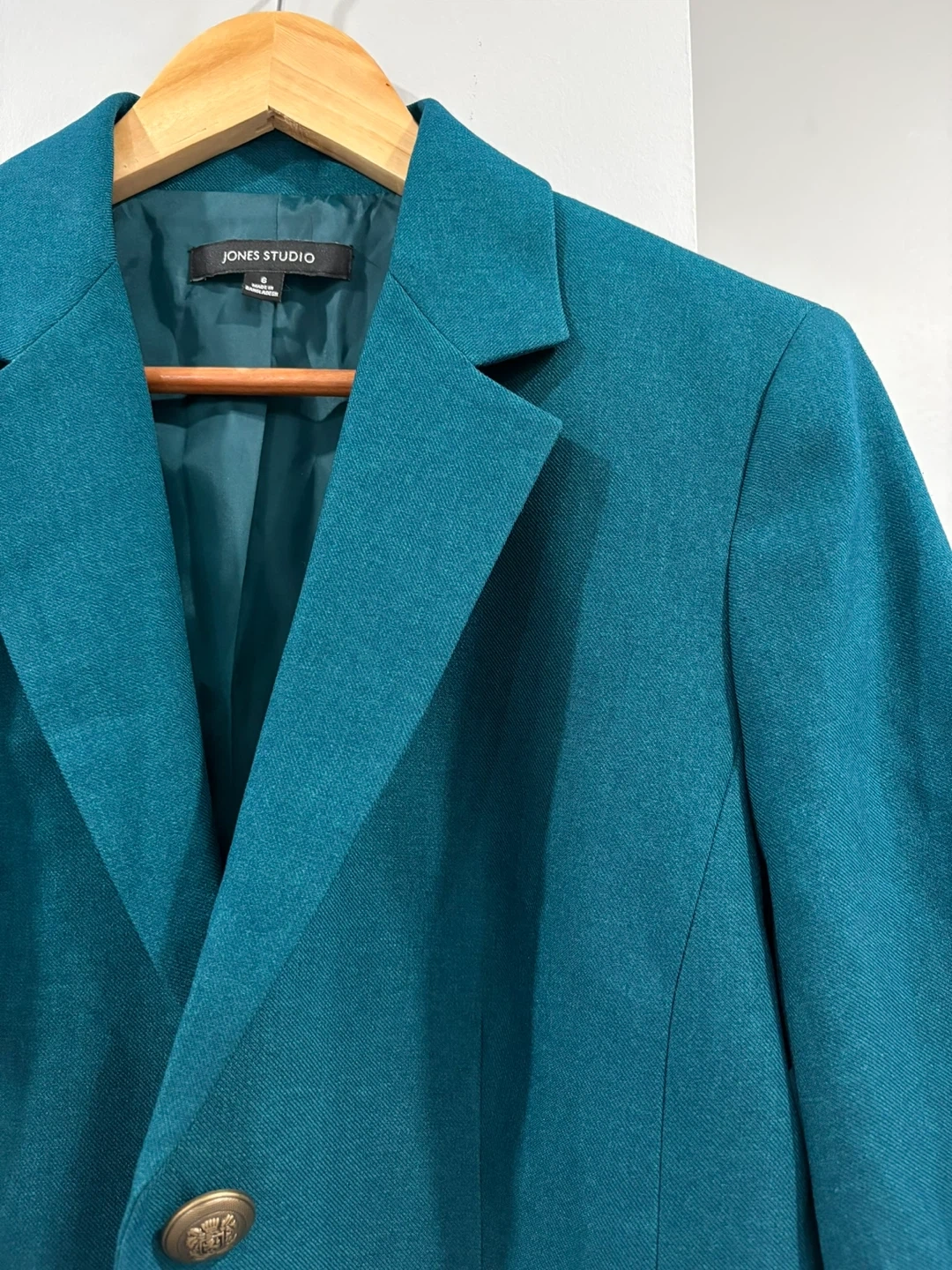 This Jones Studio blazer is a lovely teal colour. It's a size 6 with two buttons in the front. The material appears to be a blend, suitable for layering.