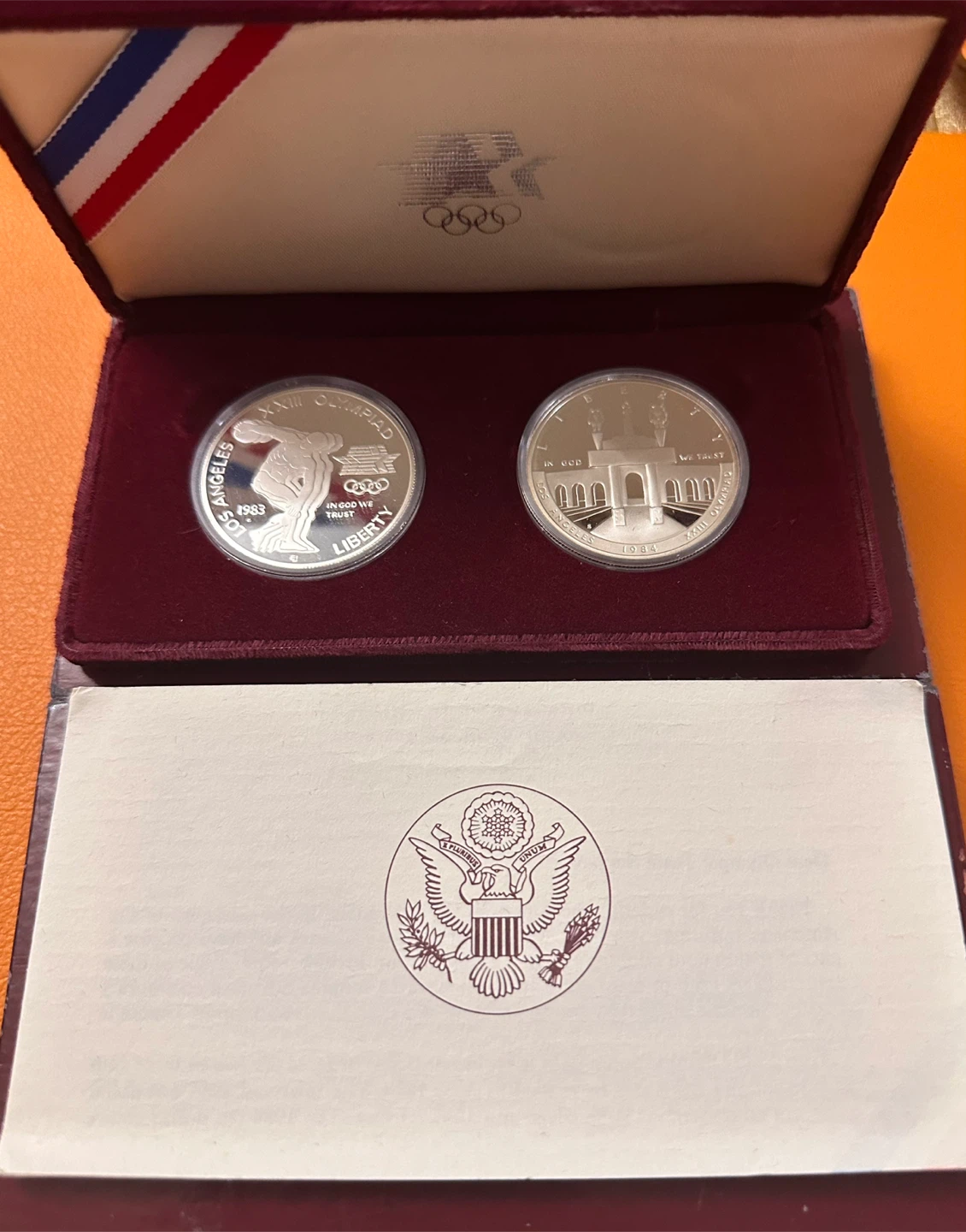 This Rare set includes two United States Silver Dollars commemorating the 1983 Los Angeles Olympics. The coins are proof quality and made of 90% silver. Features include the Eagle on one side and the Olympic rings and traditional Greek discus thrower on the other. The set includes the original box and paperwork. l