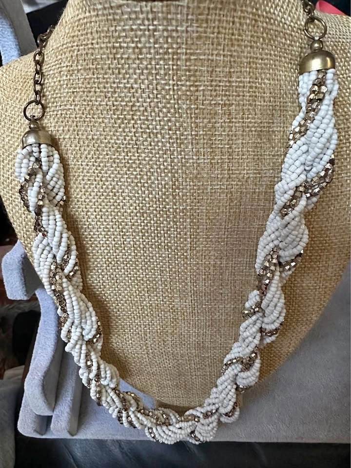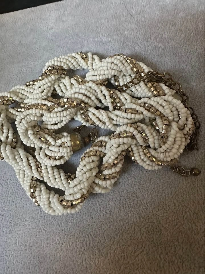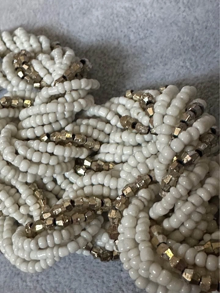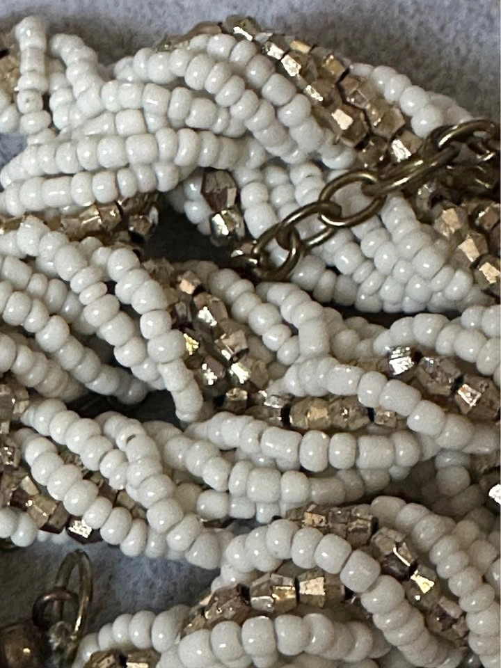 Delicate white seed glass beads interspersed with gold beads (I believe the gold beads to be plastic).