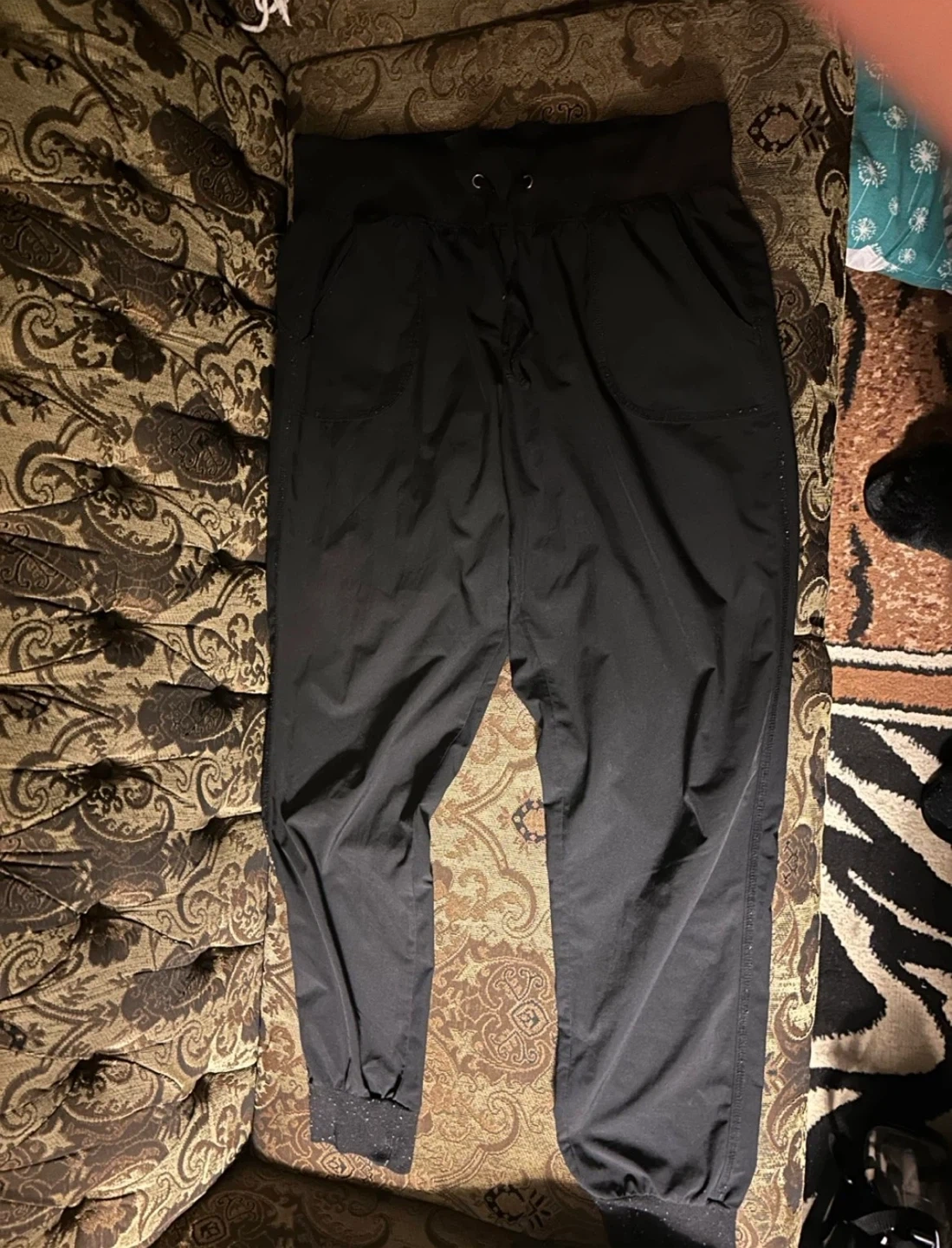 These black jogger pants have a drawstring waist and pockets. They feature elasticated cuffs. They're in great condition and super comfy! Perfect for lounging or running errands Good for casual wear.