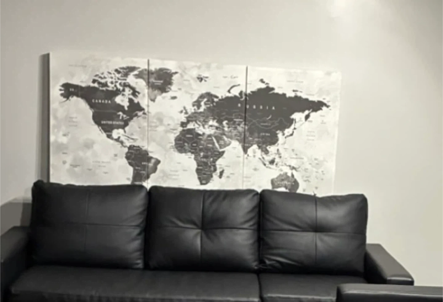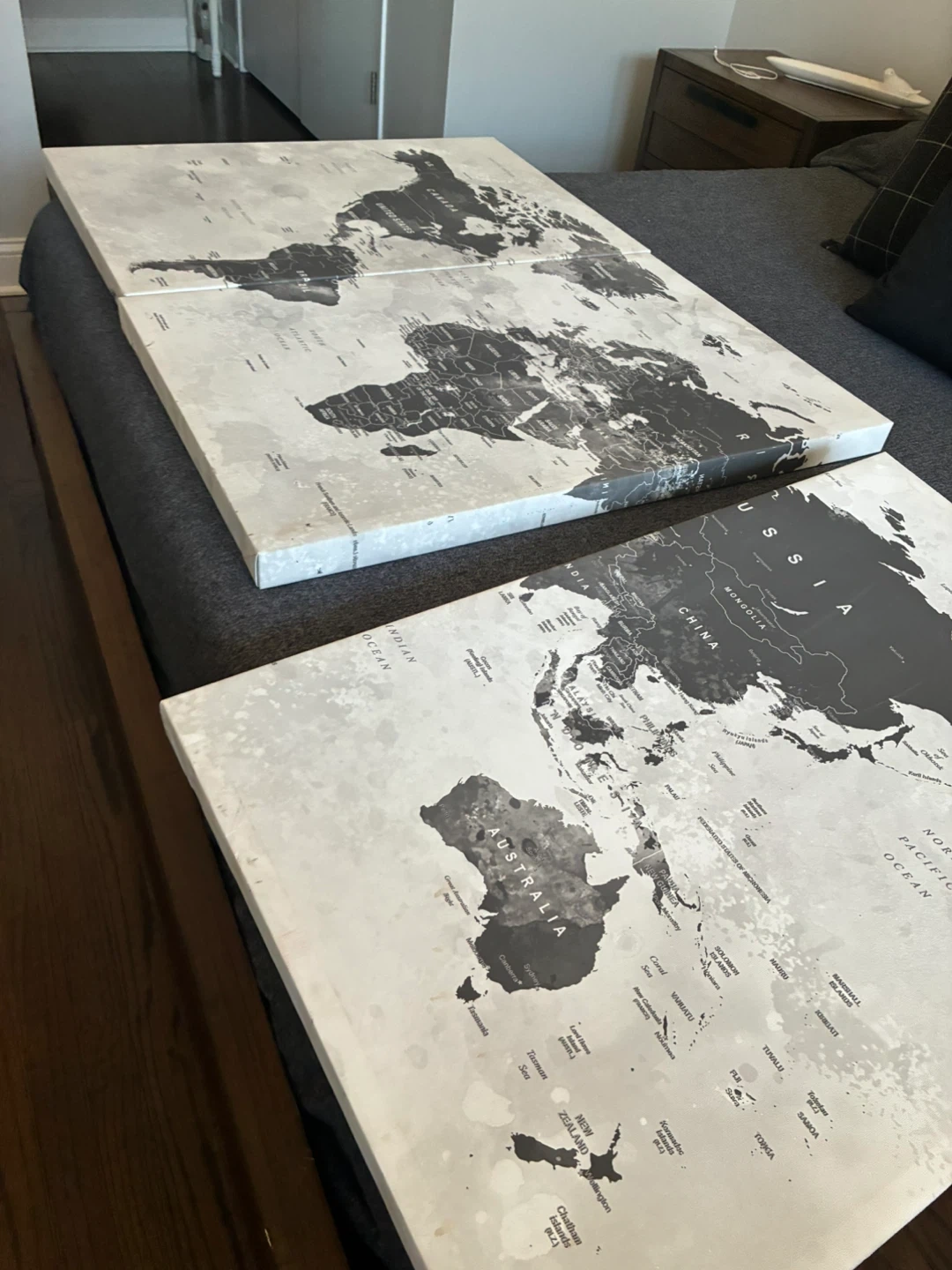 This is a large, three-panel canvas wall art featuring a world map in black and white. The map shows countries, continents, and oceans. It's a striking piece for any room!