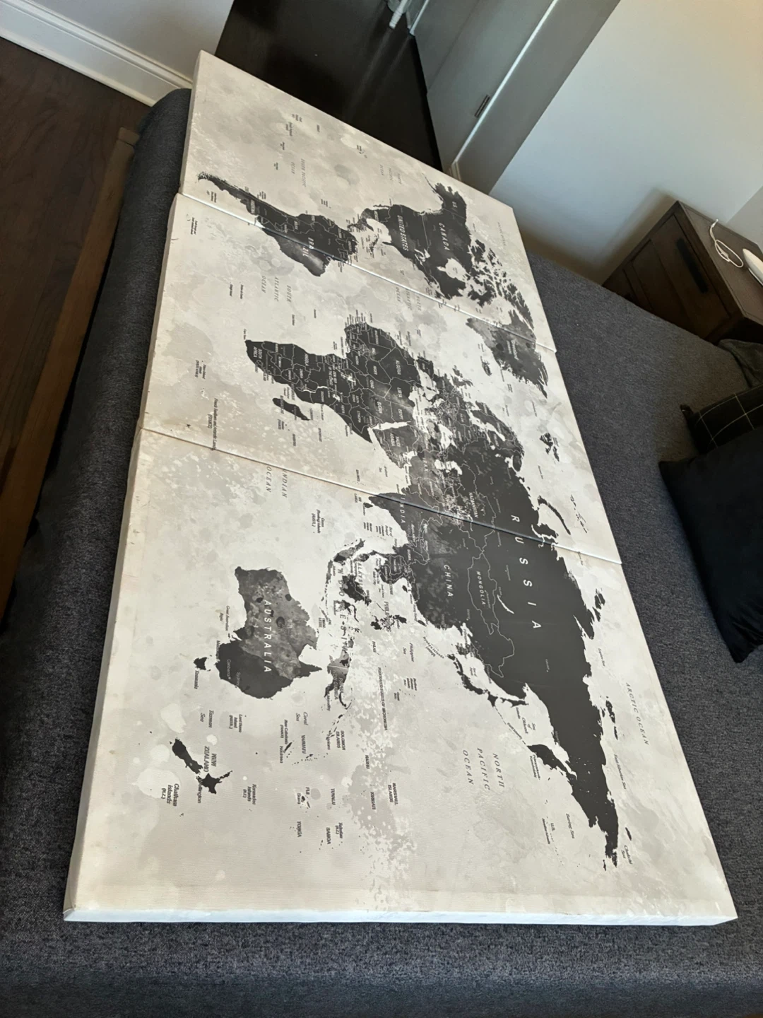 This is a large, three-panel canvas wall art featuring a world map in black and white. The map shows countries, continents, and oceans. It's a striking piece for any room!