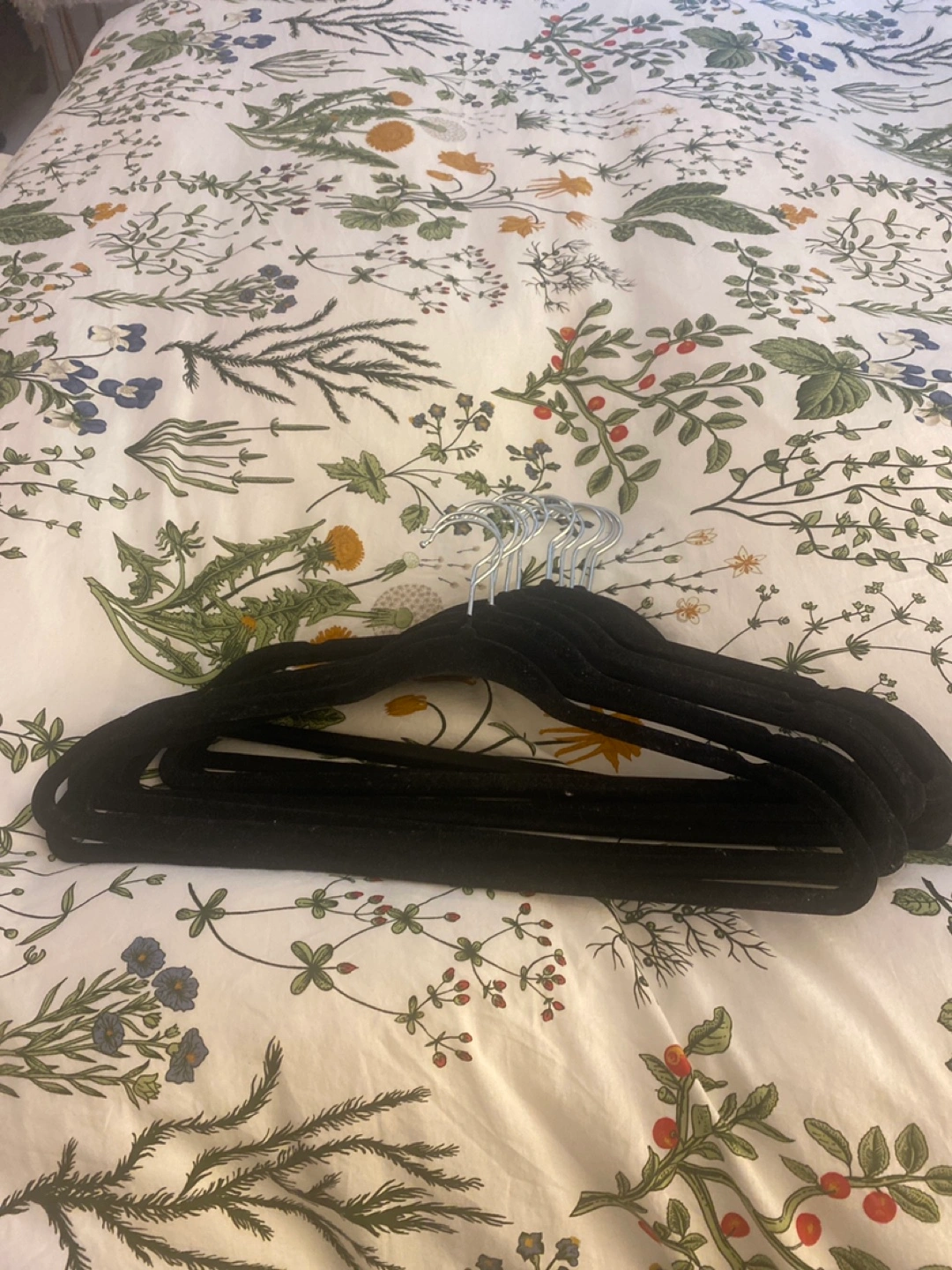 Selling a set of 12 black velvet clothes hangers. They're great for keeping your clothes from slipping off and are in good condition. Perfect for organizing your closet!