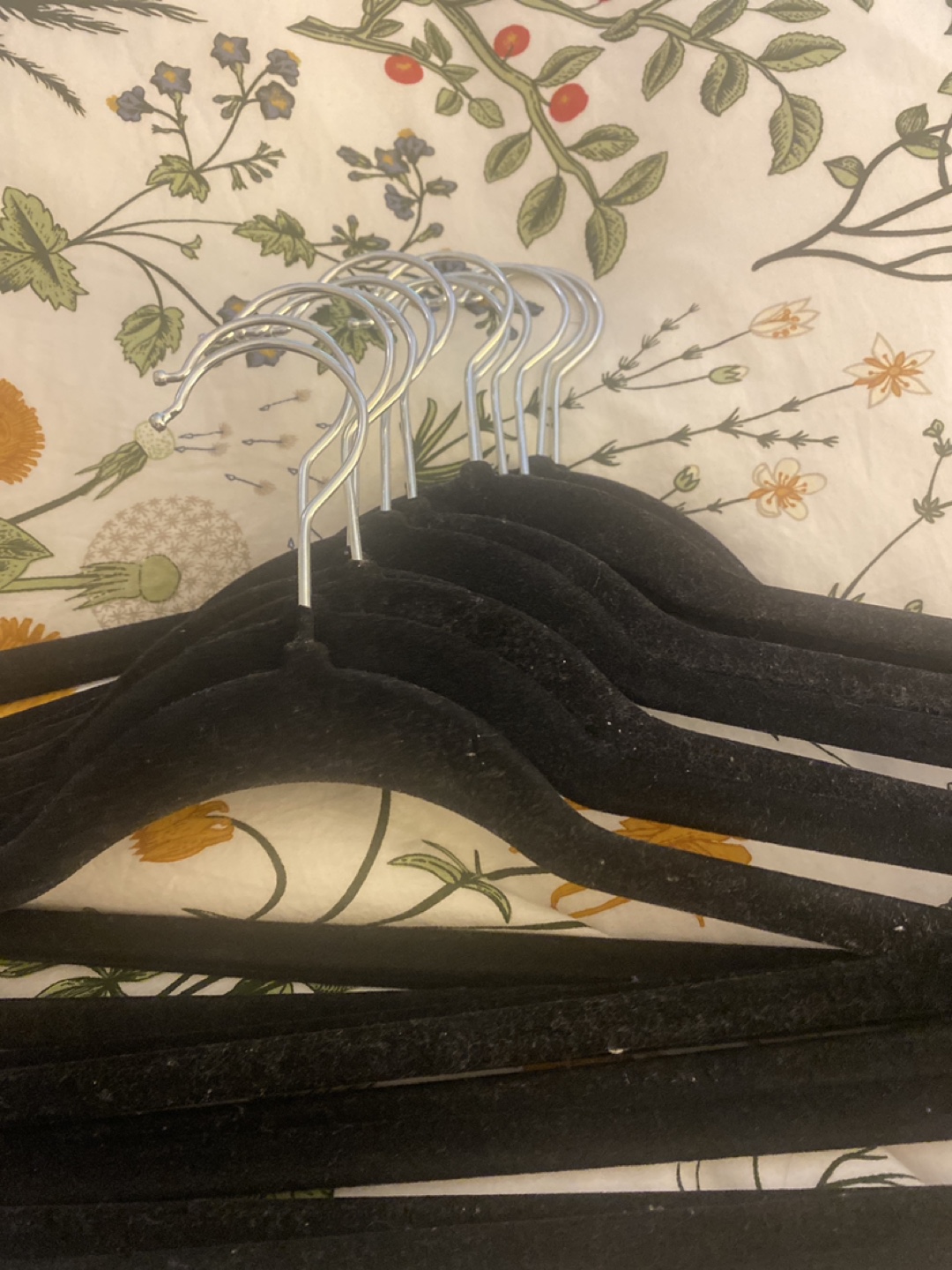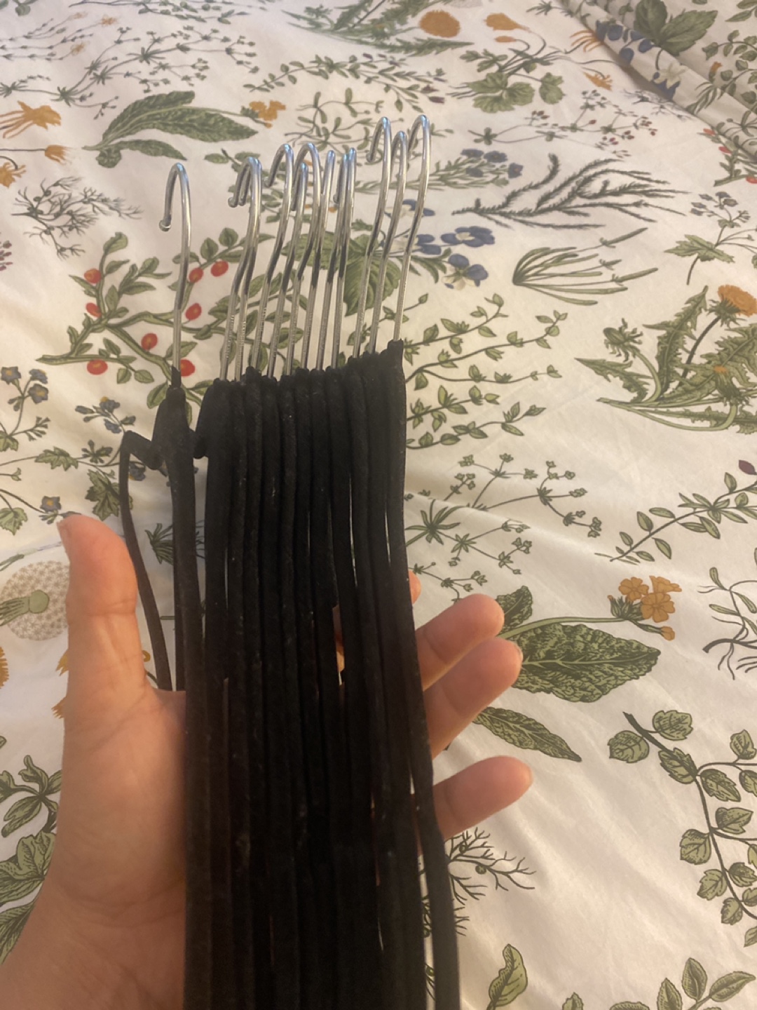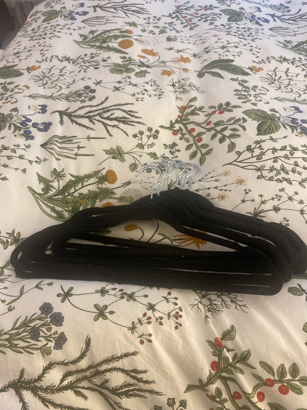 Selling a set of 12 black velvet clothes hangers. They're great for keeping your clothes from slipping off and are in good condition. Perfect for organizing your closet!
