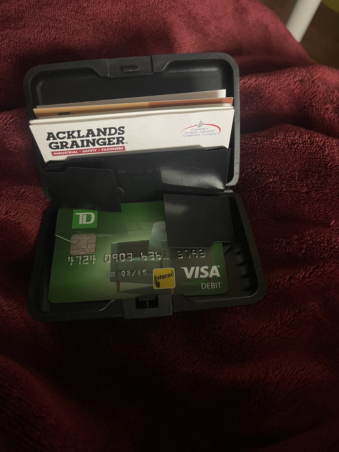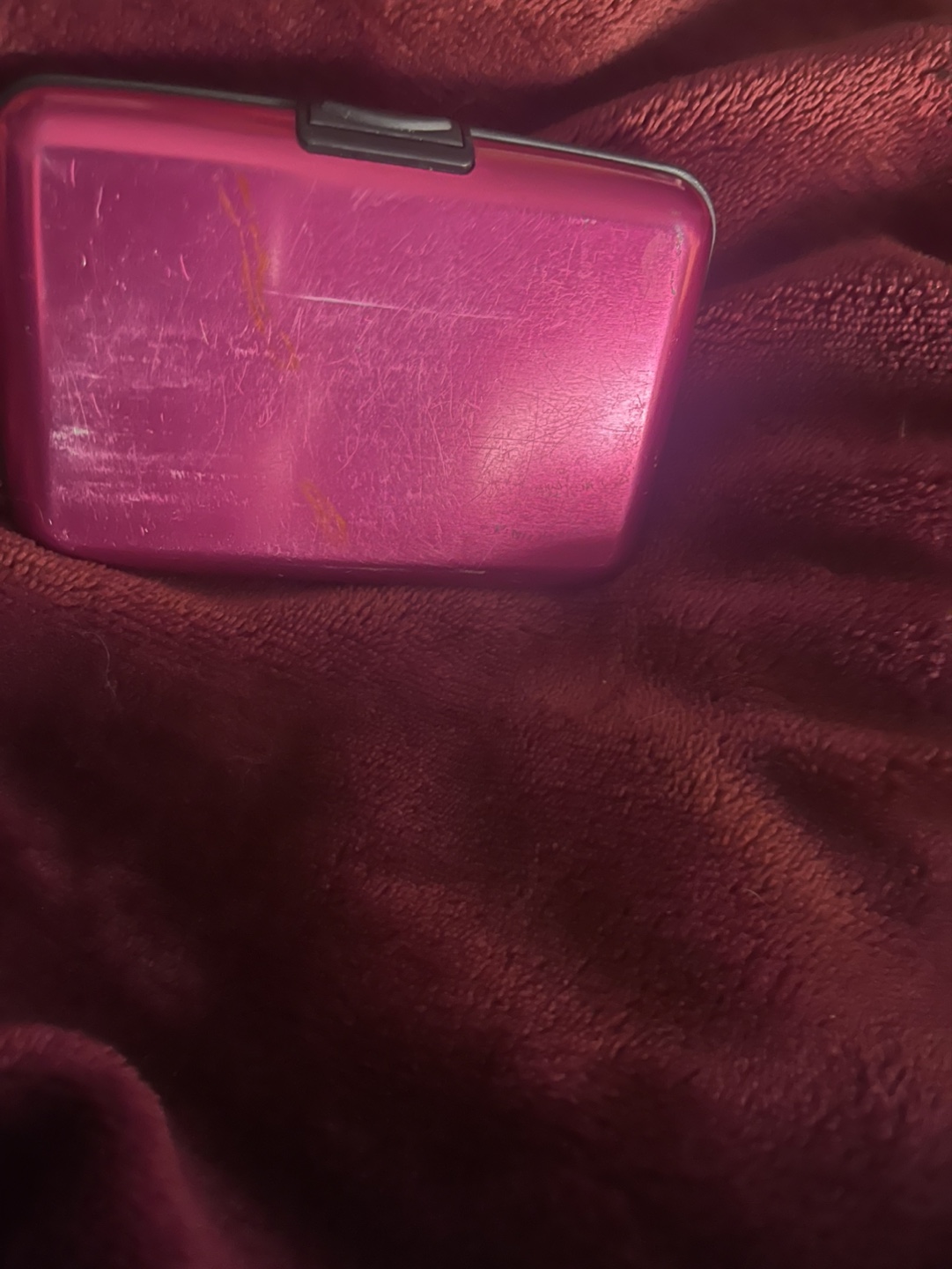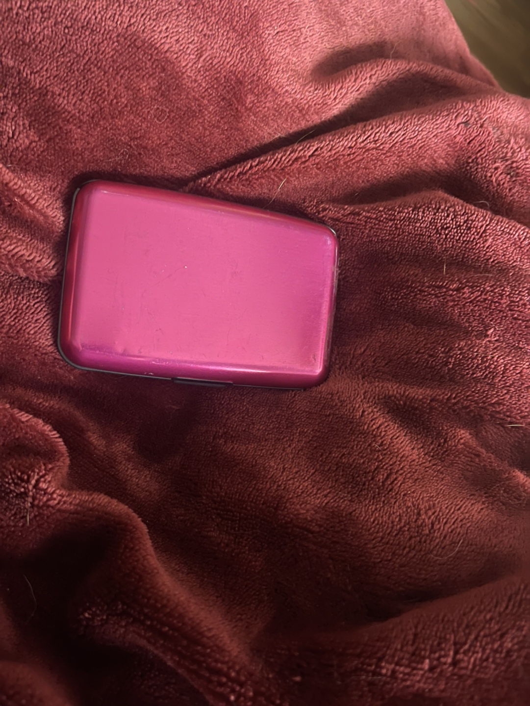 Compact aluminum card holder. Holds multiple cards. Features a snap closure. Shows some minor wear.
