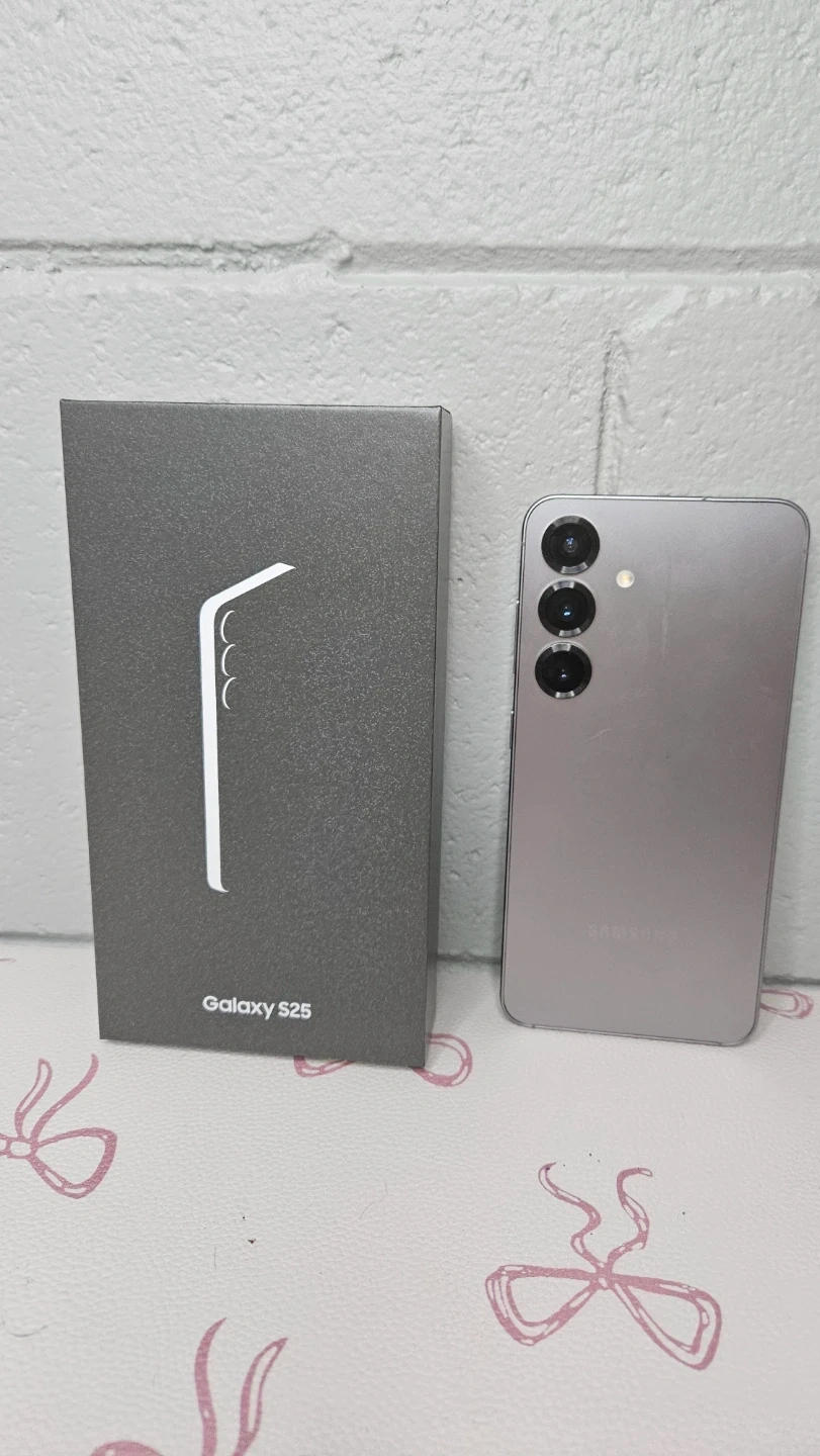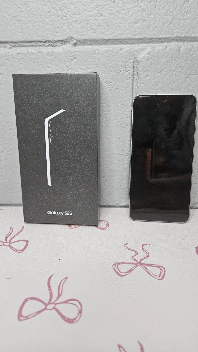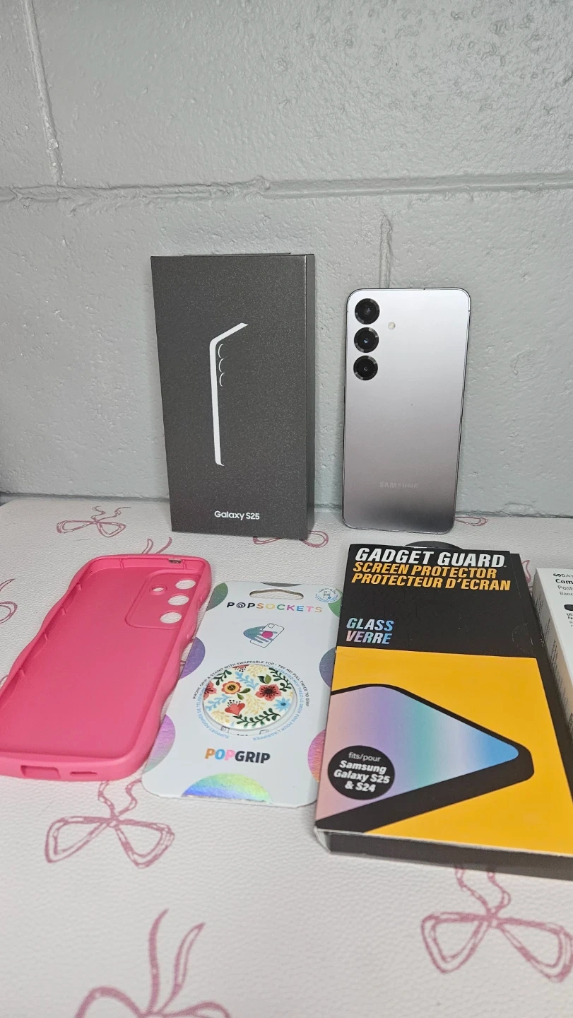 A new Samsung Galaxy S25 smartphone in silver. It comes with its origial box, a pink phone case, a PopGrip, and a Gadget Guard screen protector. This phone is great for anyone needing a reliable and modern mobile device.