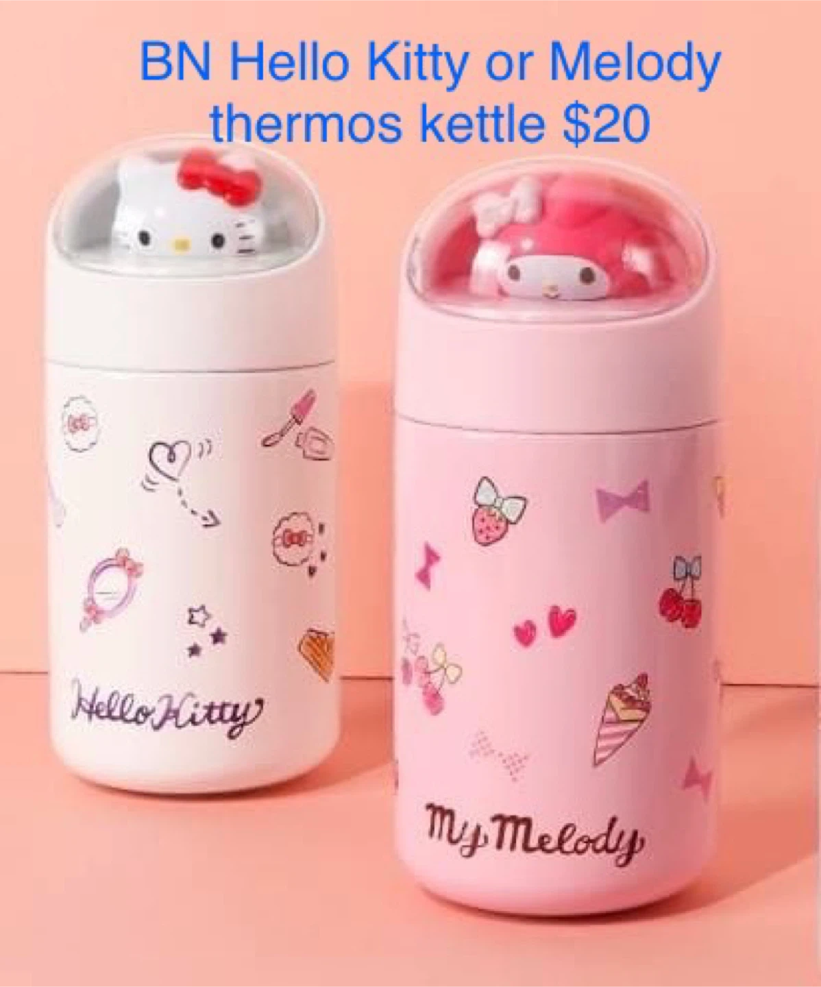 I'm selling a brand new Hello Kitty or Melody thermos kettle. It's super cute and perfect for keeping your drinks hot or cold on the go! The thermos features a delightful Hello Kitty or Melody design that adds a touch of fun to your day