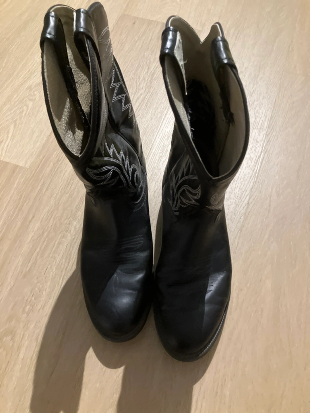 Black leather cowboy boots with silver stitching. Size 8. Made in Canada.