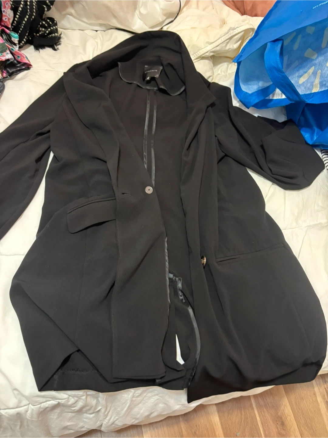 Black Dynamite blazer. It's a medium size. Features two front pockets and a single button closure.
