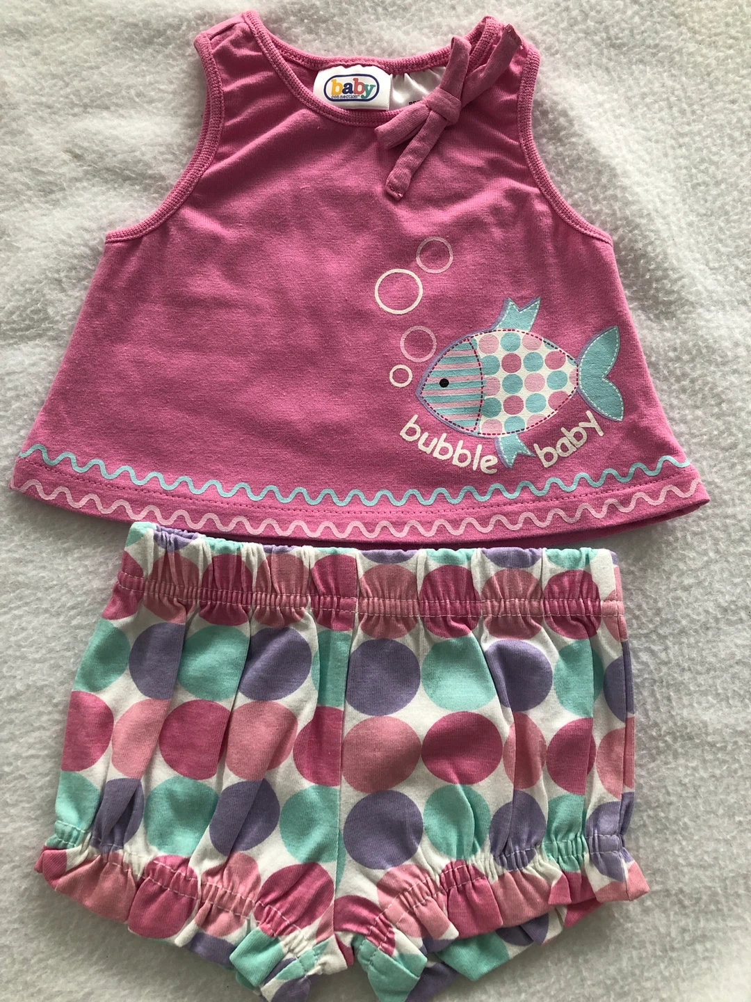 This NEW adorable pink baby girl's top and shorts set features a "Bubble Baby" fish graphic. The top is sleeveless with a rounded neckline, and the matching shorts have an elastic waistband and ruffled leg openings. Both pieces are made from 100% cotton. They're perfect for keeping your little one comfy! Check out my other listings. Discounts on individual price when buying 2 or more items.